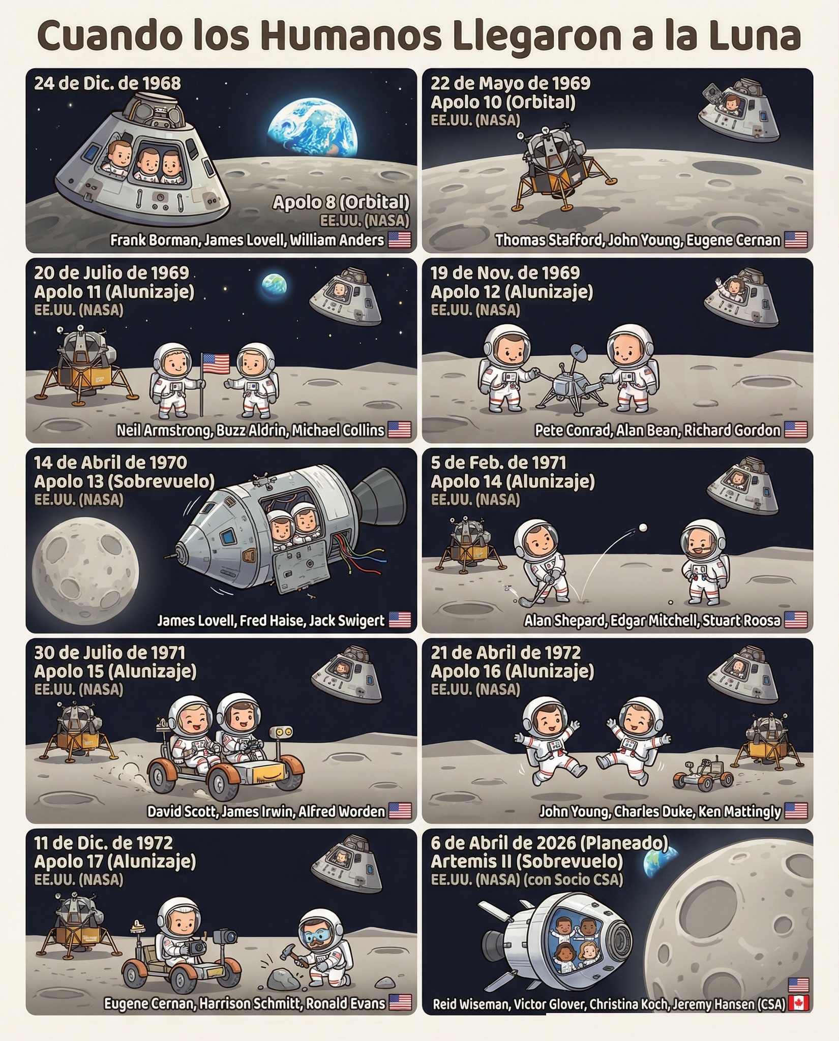 Esta infografía recopila de forma clara y visual las misiones más importantes del programa Apolo y la futura misión Artemis II, permitiendo al alumnado comprender la cronología, los astronautas implicados y el tipo de misión realizada.