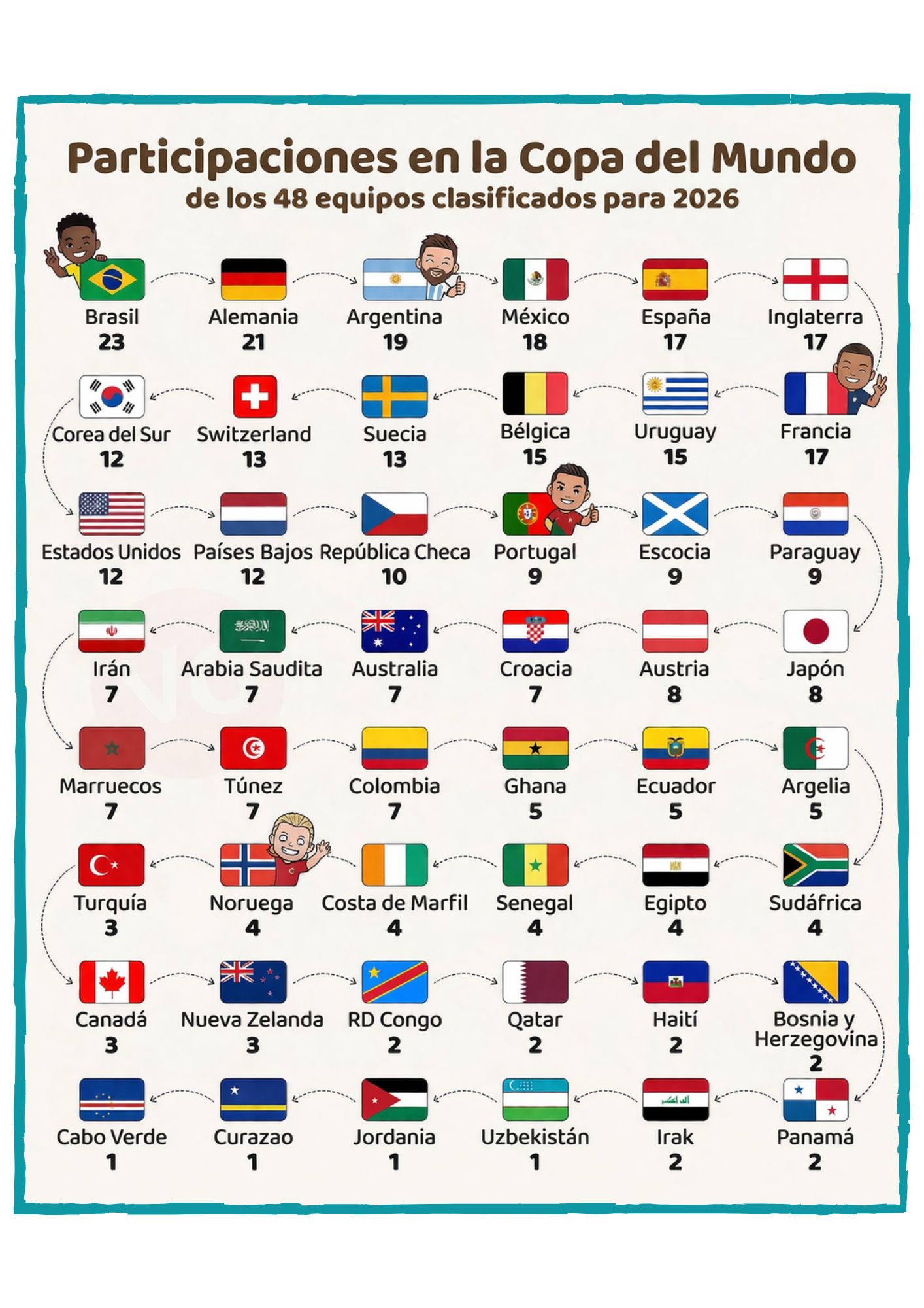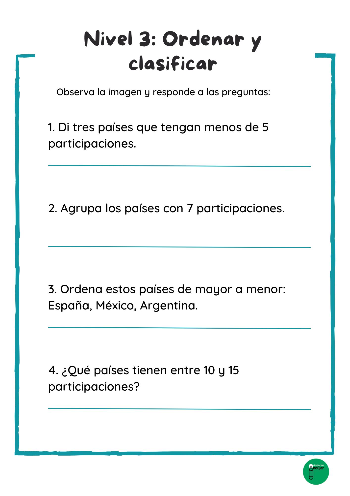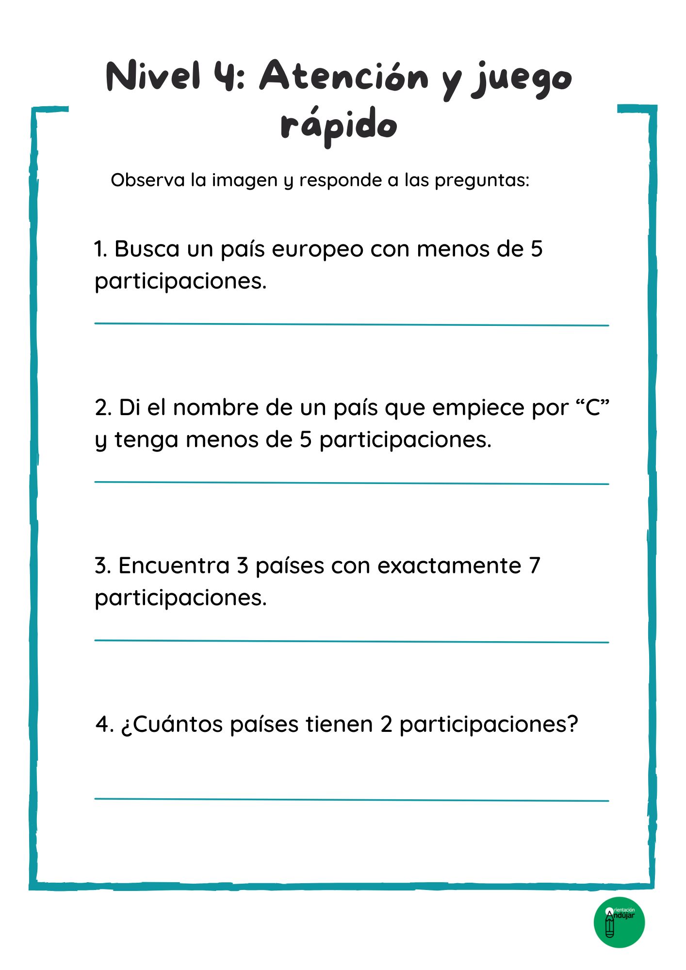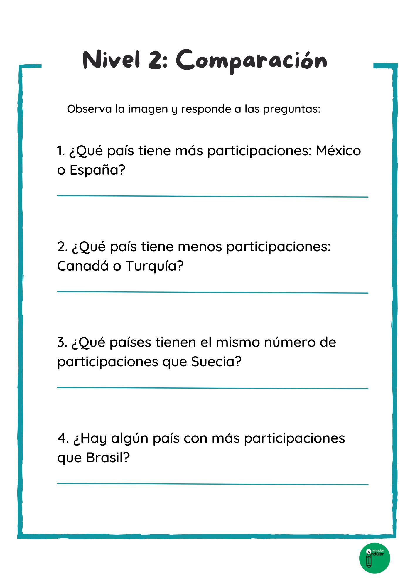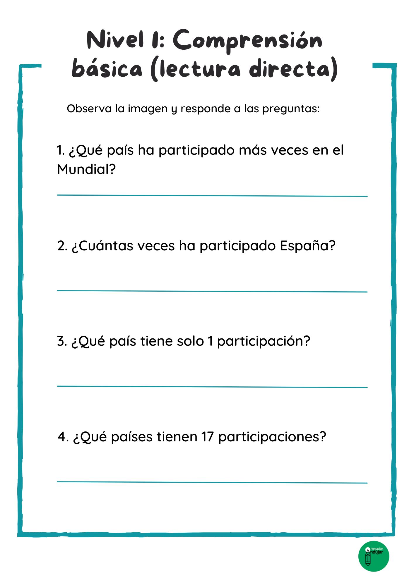 Trabajar la comprensión lectora y el análisis de datos en el aula es una de las claves para desarrollar un aprendizaje competencial real. En este recurso utilizamos una infografía atractiva y cercana al alumnado, basada en las participaciones de diferentes países en la Copa del Mundo, para convertir la interpretación de información en una actividad motivadora. El fútbol, como temática universal, actúa como elemento motivador que facilita la implicación del alumnado, especialmente en Educación Primaria.