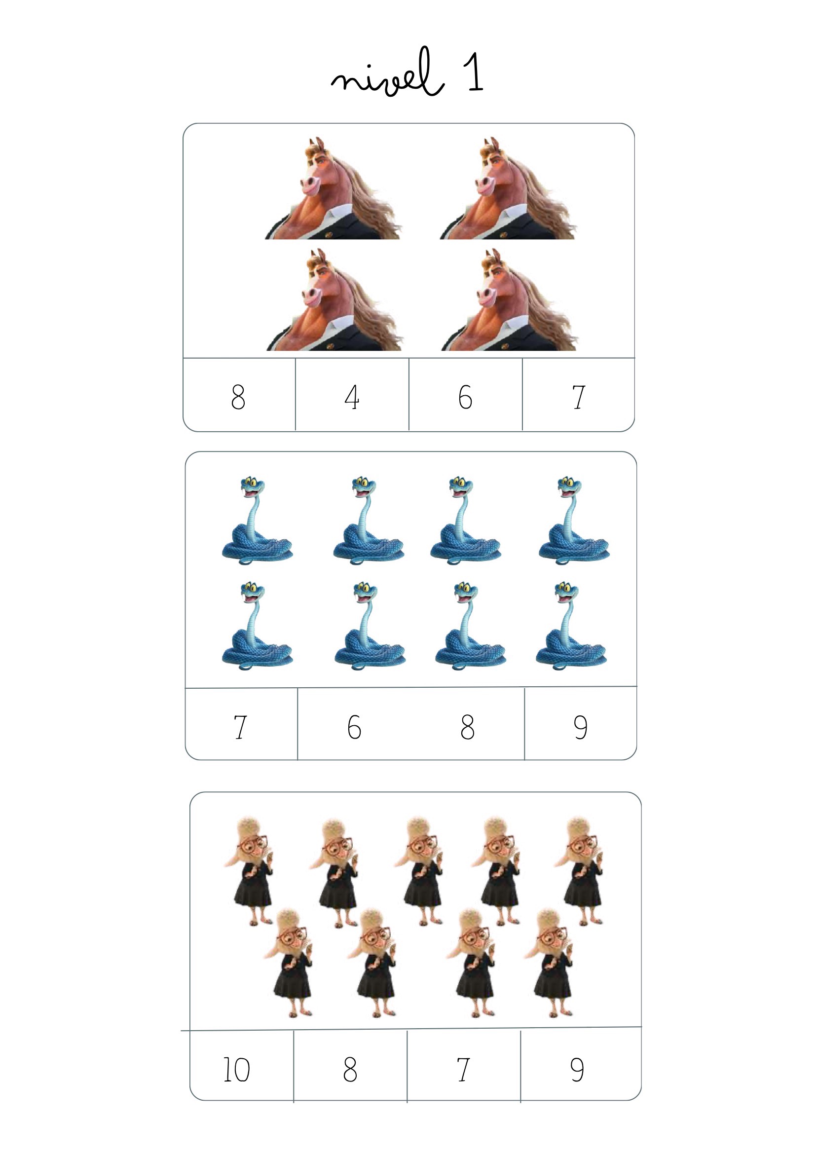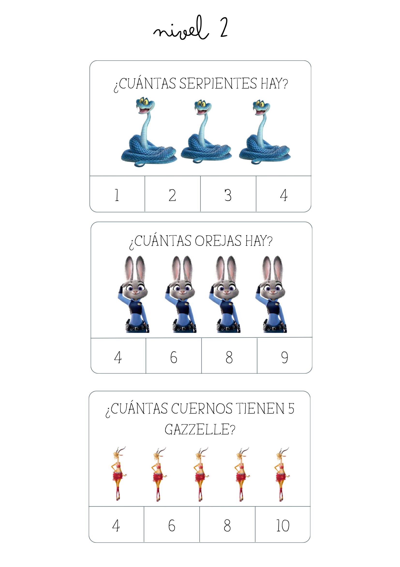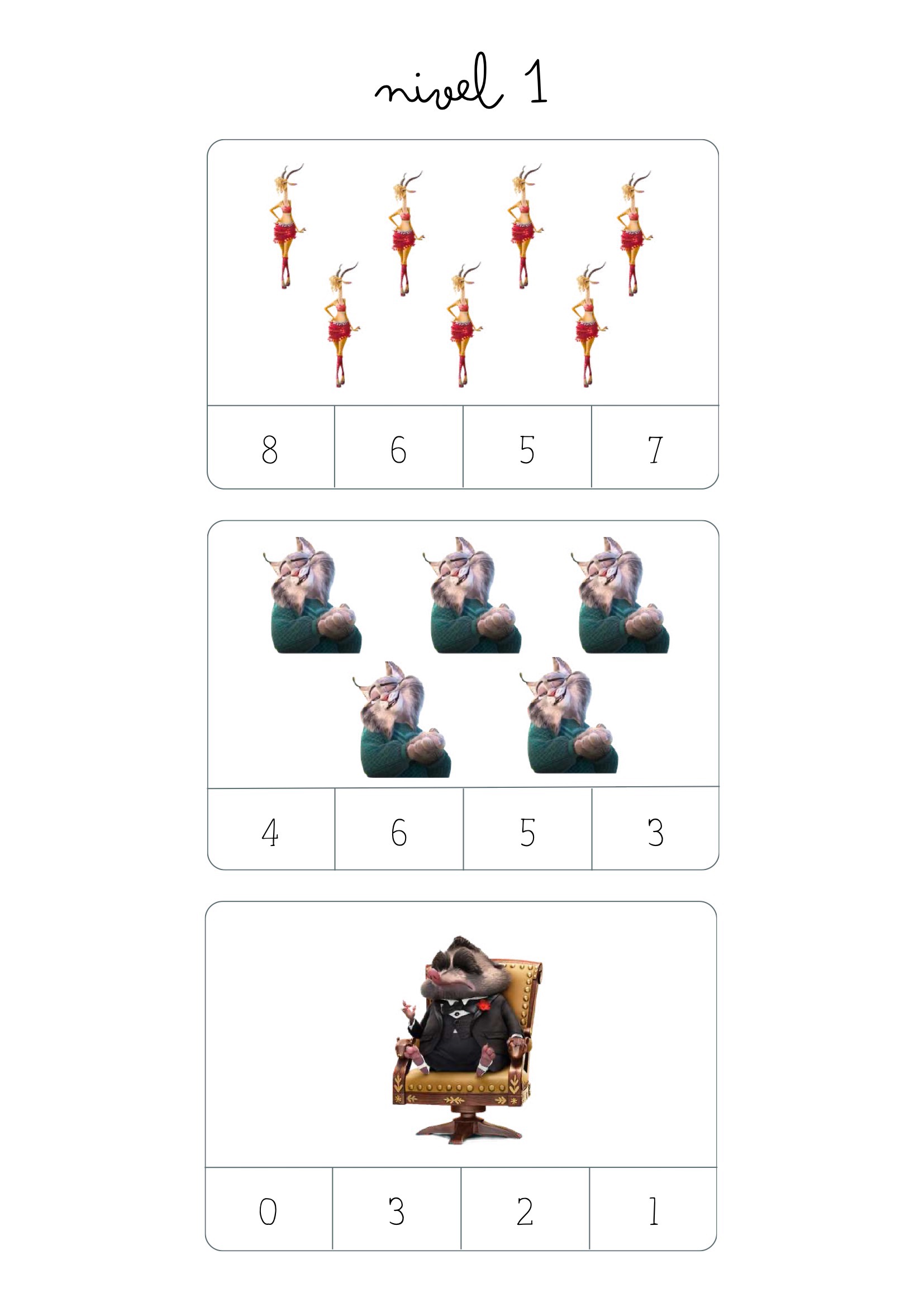 Este recurso propone tarjetas visuales donde aparecen personajes de la película acompañados de cantidades, números o espacios para completar. Una forma divertida y significativa de trabajar conteo, asociación visual y pensamiento lógico.