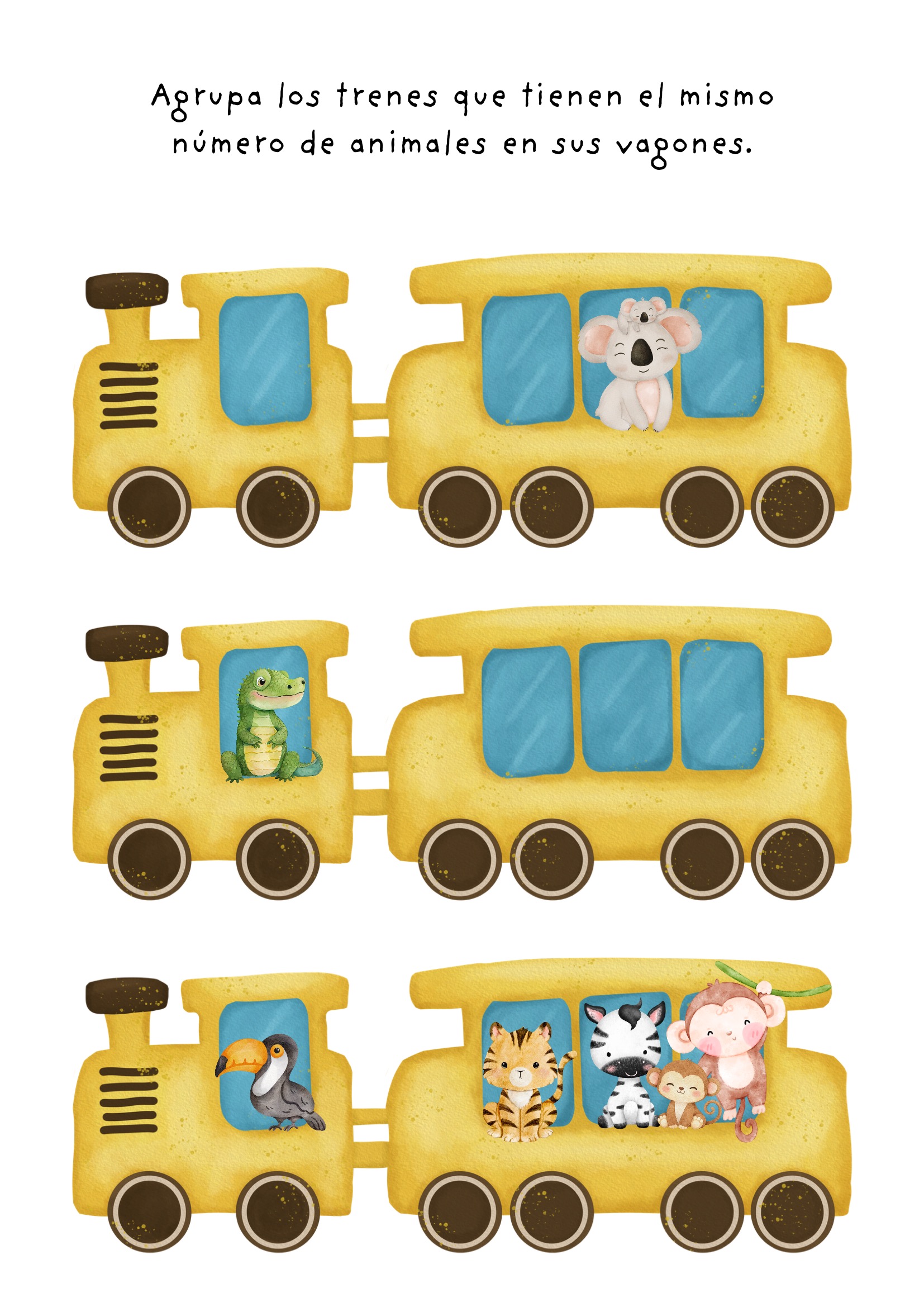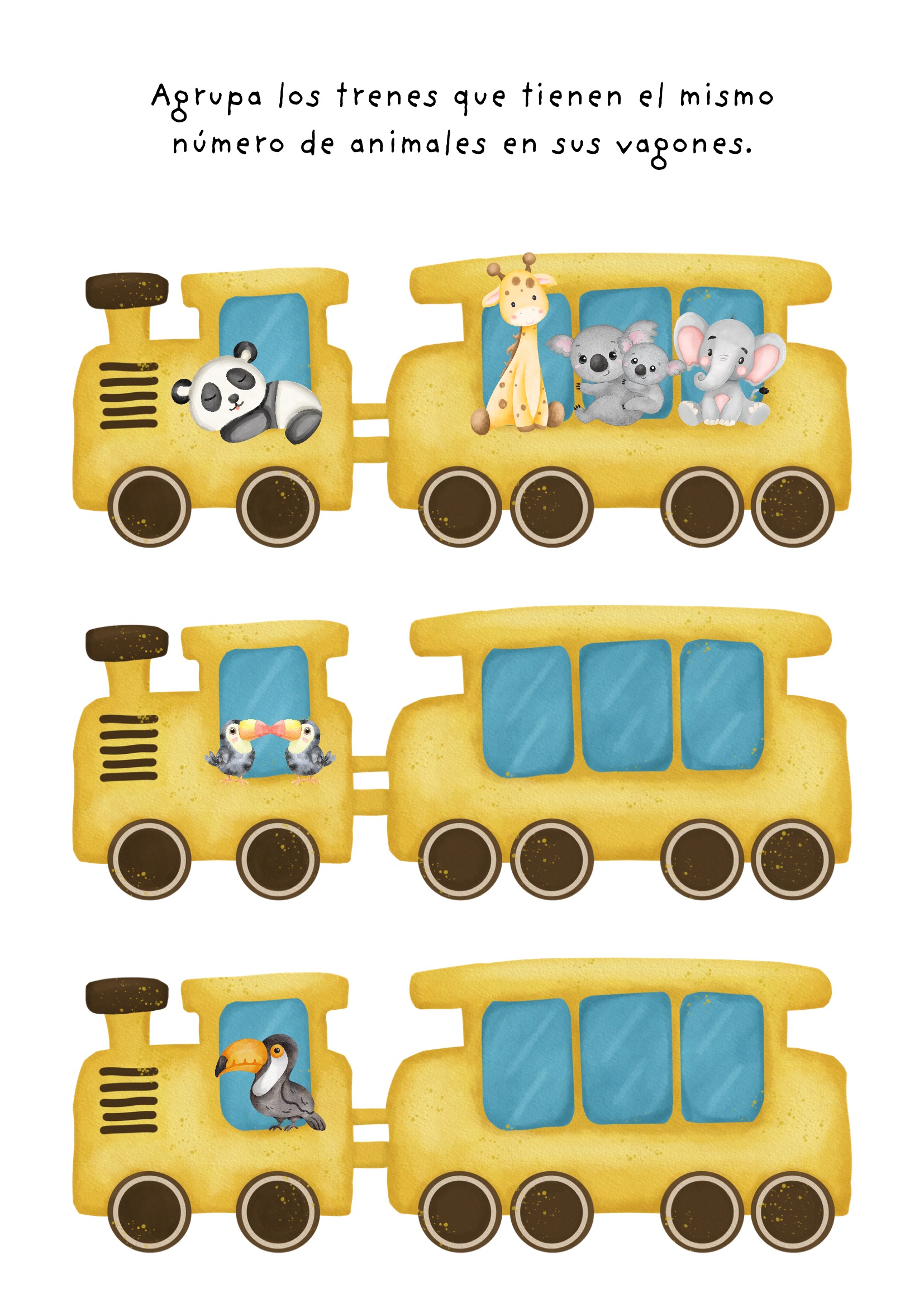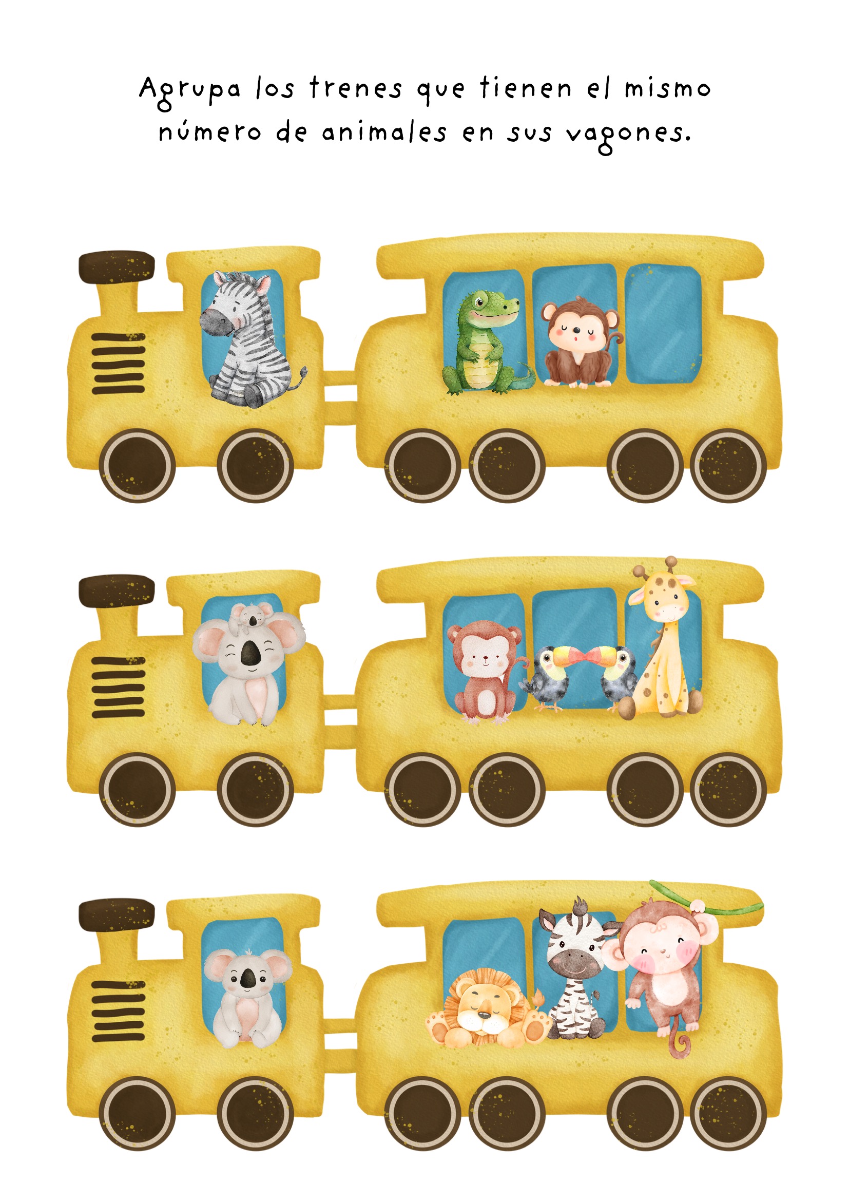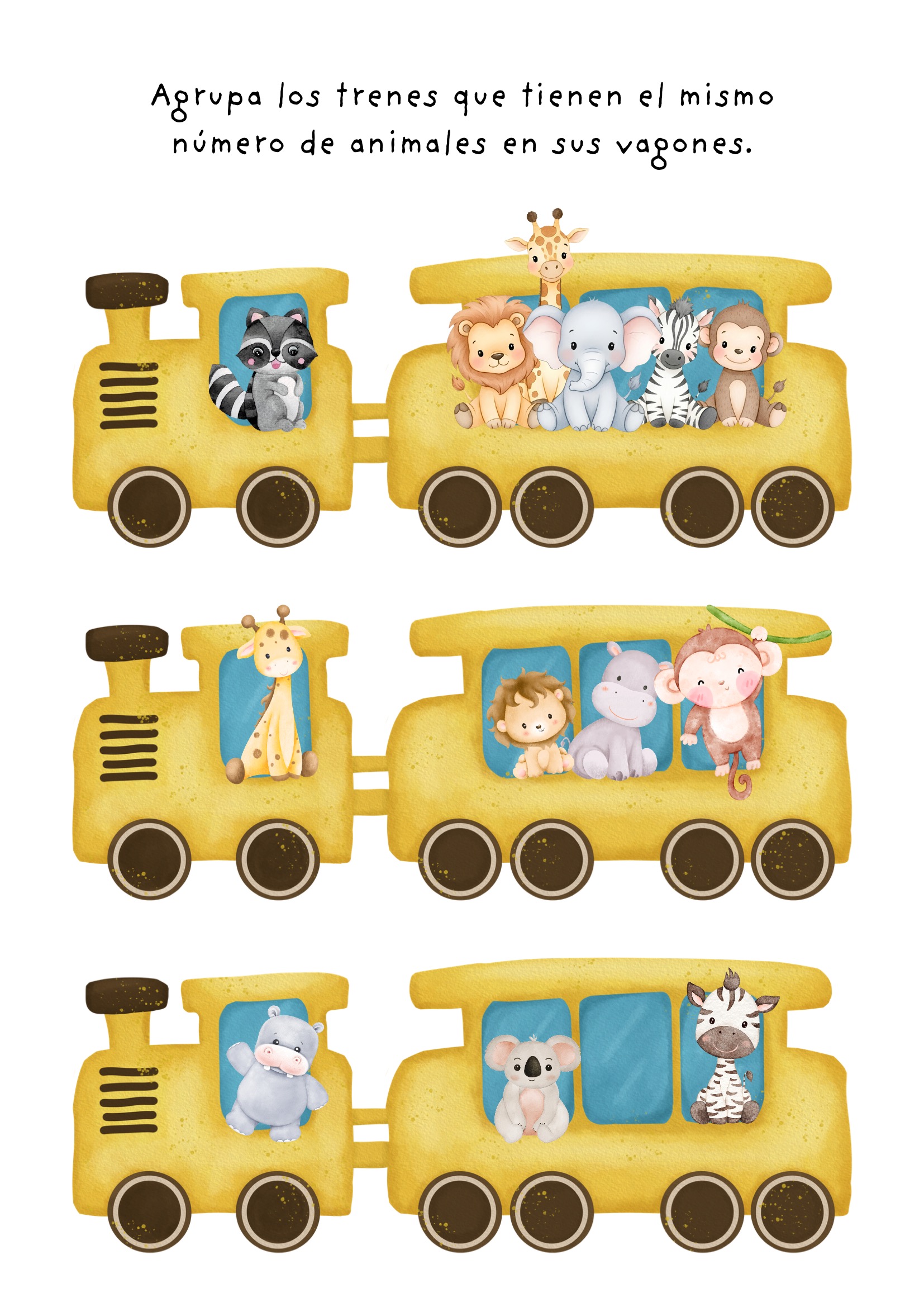 A través de trenes, peceras, árboles, troncos y cartas ilustradas, los niños y niñas entrenan la atención, la discriminación visual y la lógica, mientras juegan con escenas llenas de color.