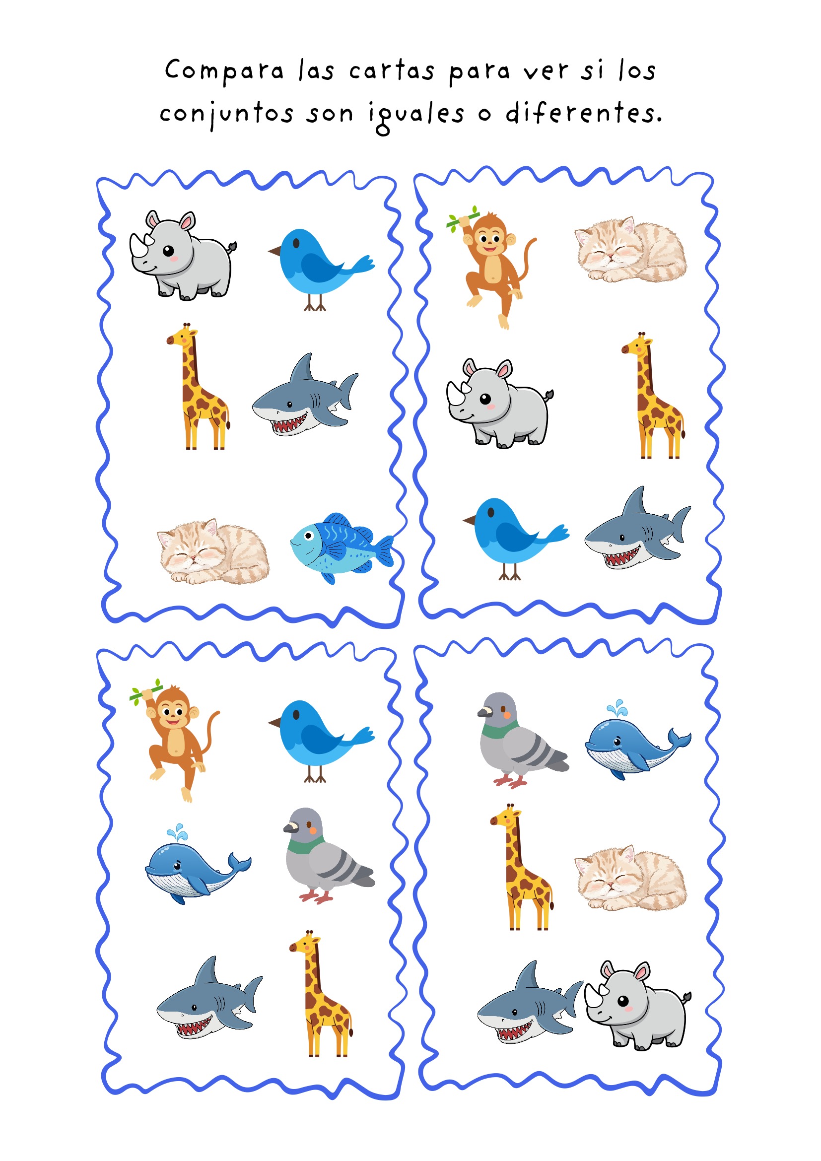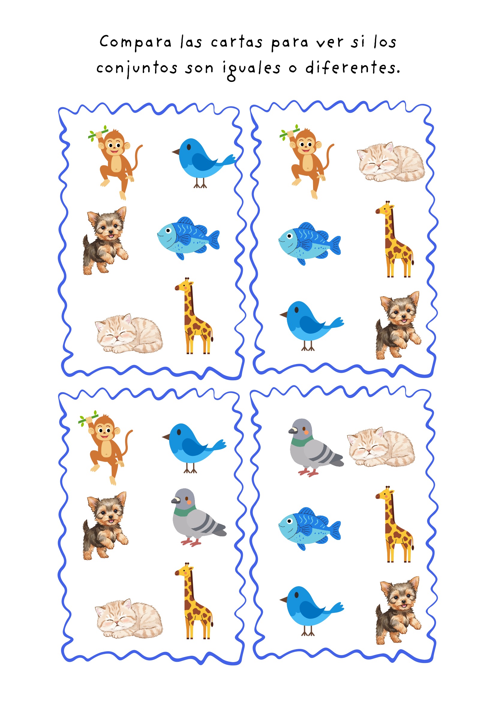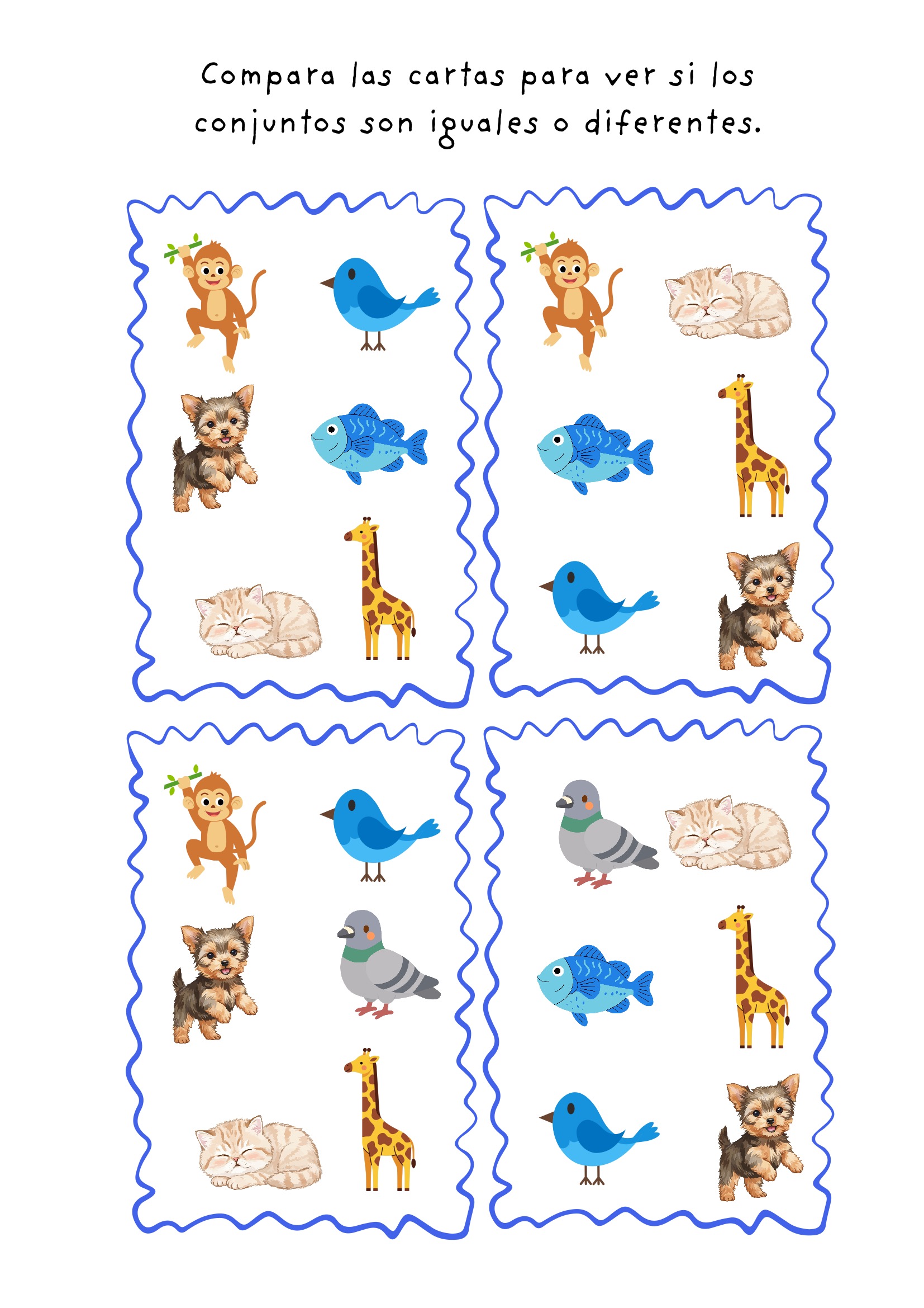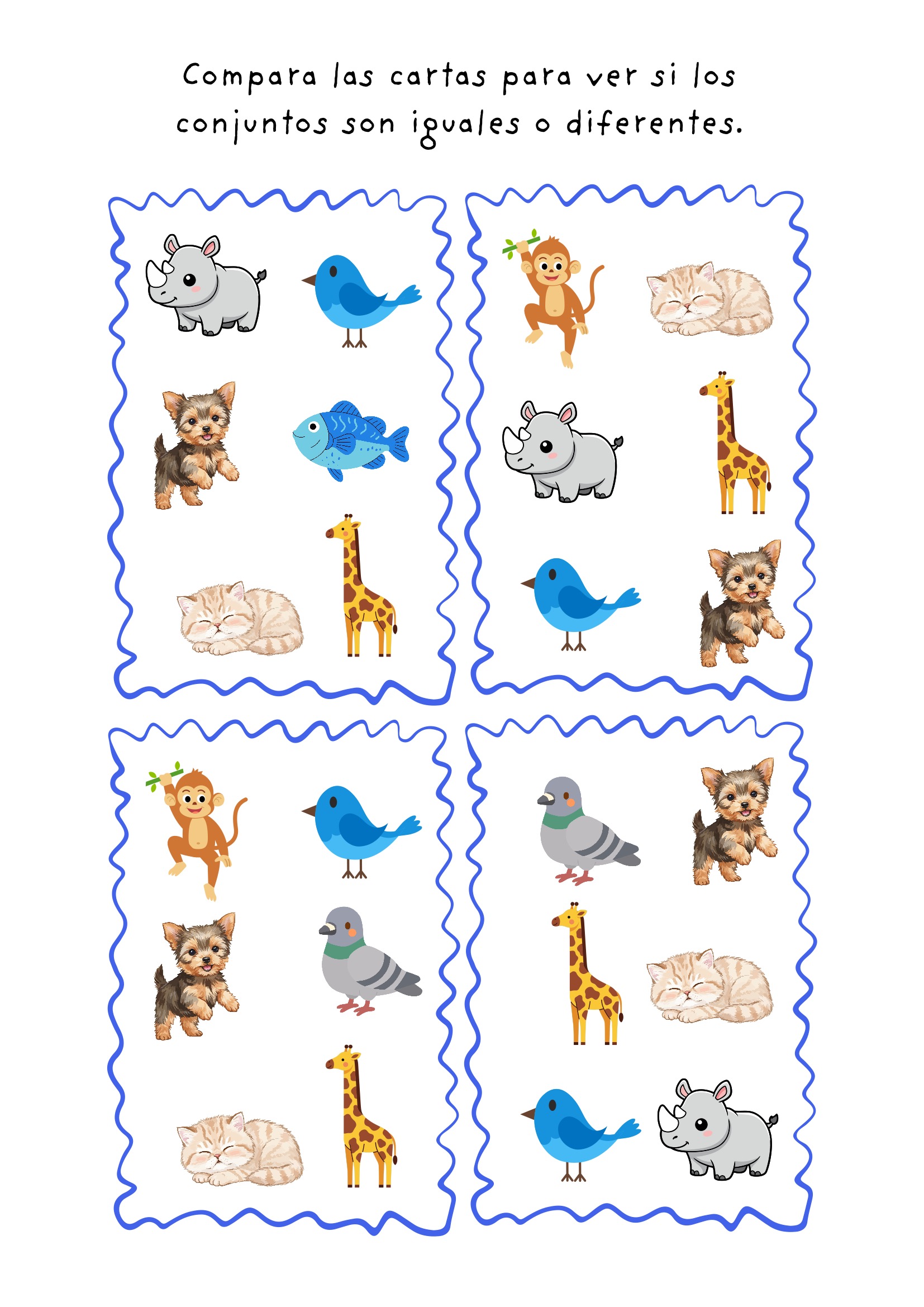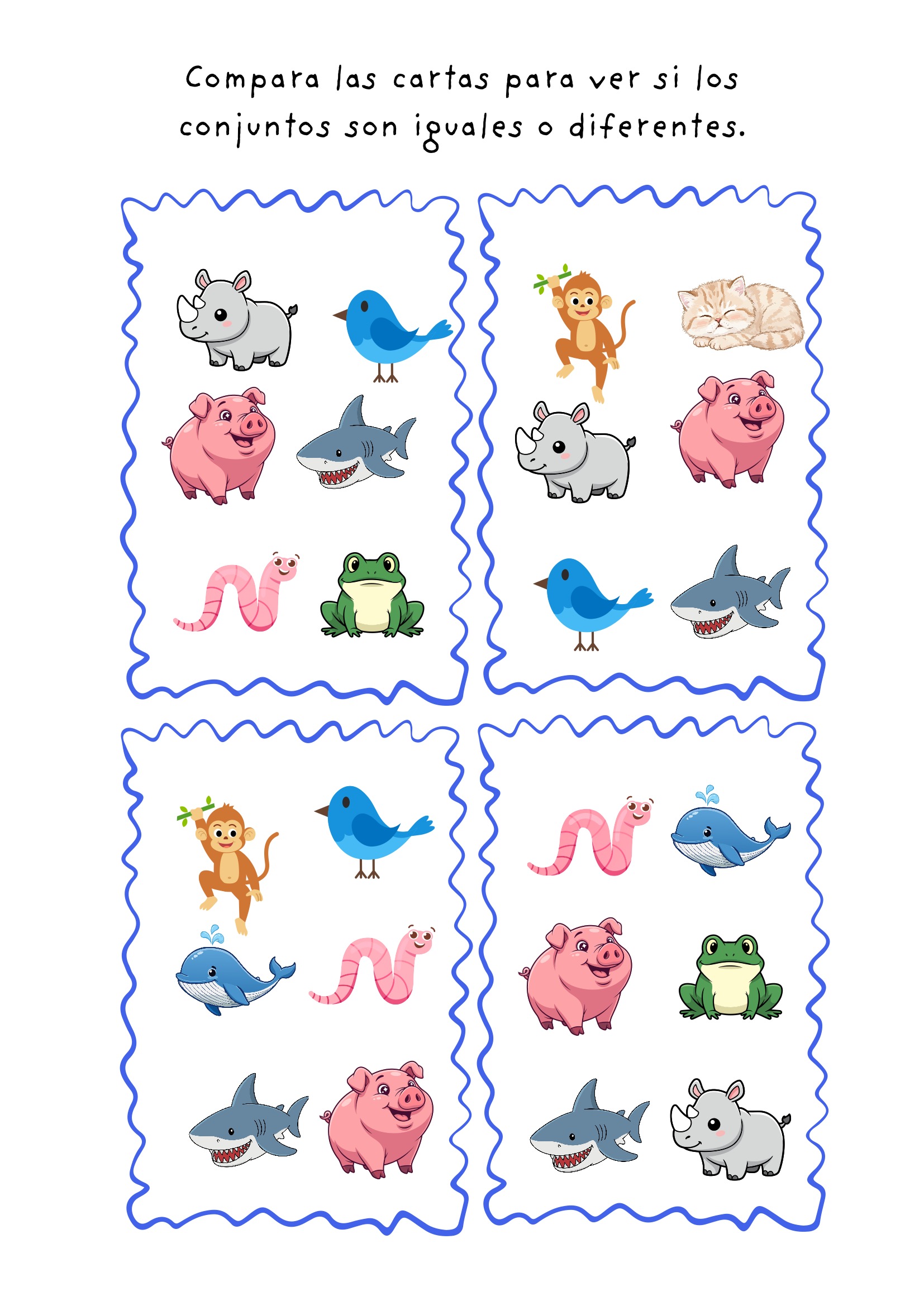 Trabajar conjuntos, igualdad y clasificación es clave para el desarrollo del pensamiento lógico-matemático. Este recurso de conjuntos e iguales con animales propone actividades visuales y muy atractivas donde el alumnado debe observar, comparar, agrupar y decidir si los conjuntos son iguales o diferentes… siempre con animales como protagonistas.