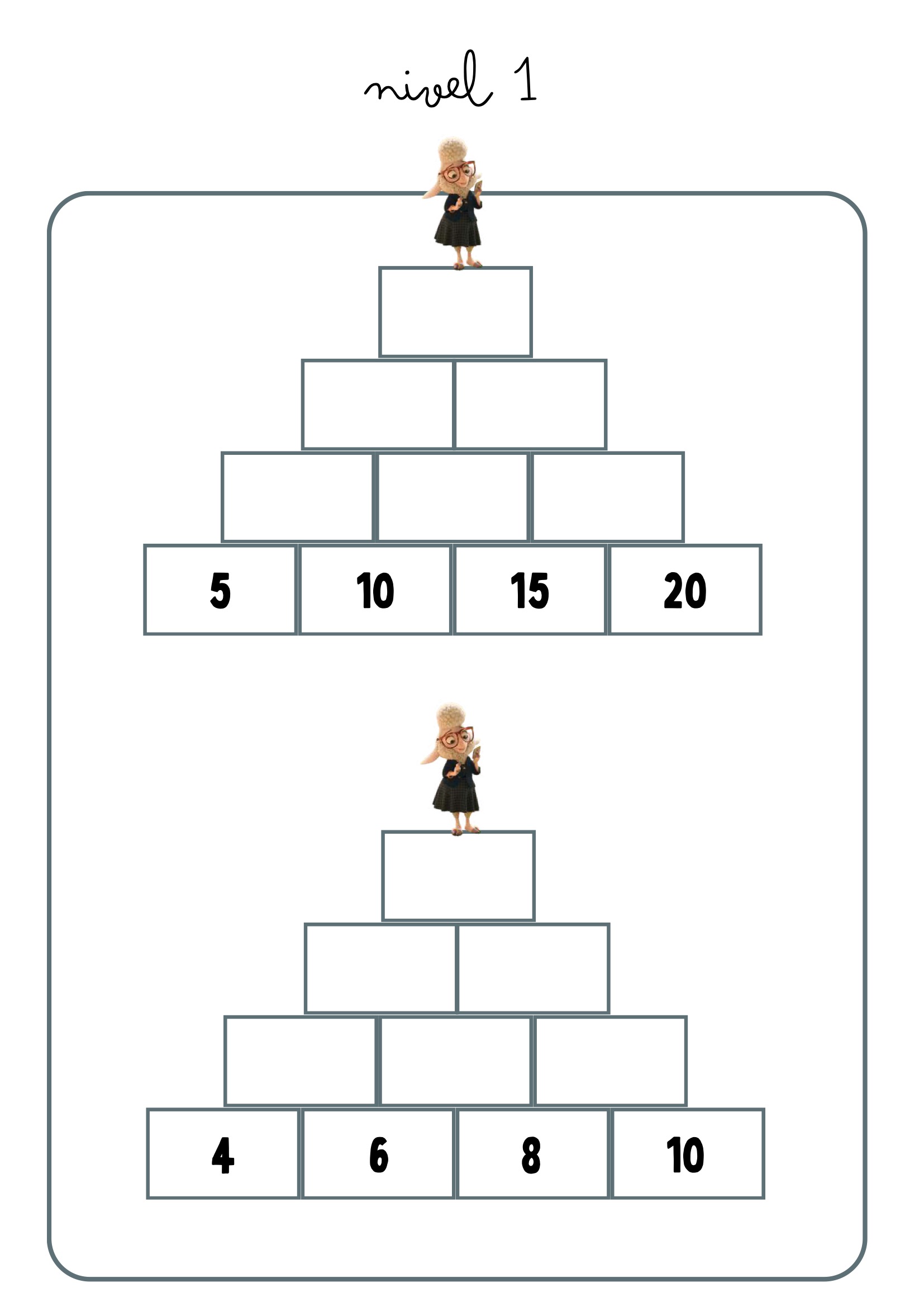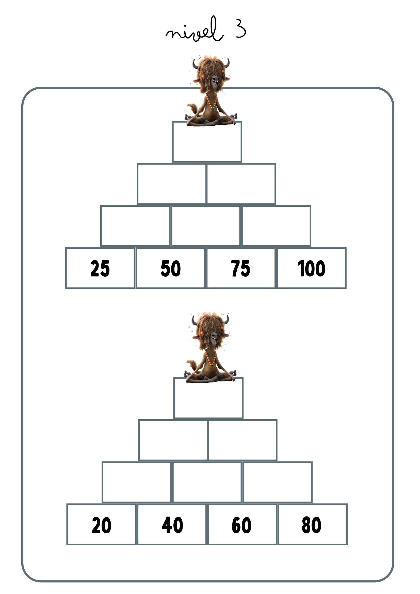 Cada pirámide presenta una base de números y espacios vacíos que deben completarse aplicando operaciones como suma, resta, multiplicación o división, según el nivel. Una propuesta ideal para reforzar cálculo mental, atención y razonamiento lógico.