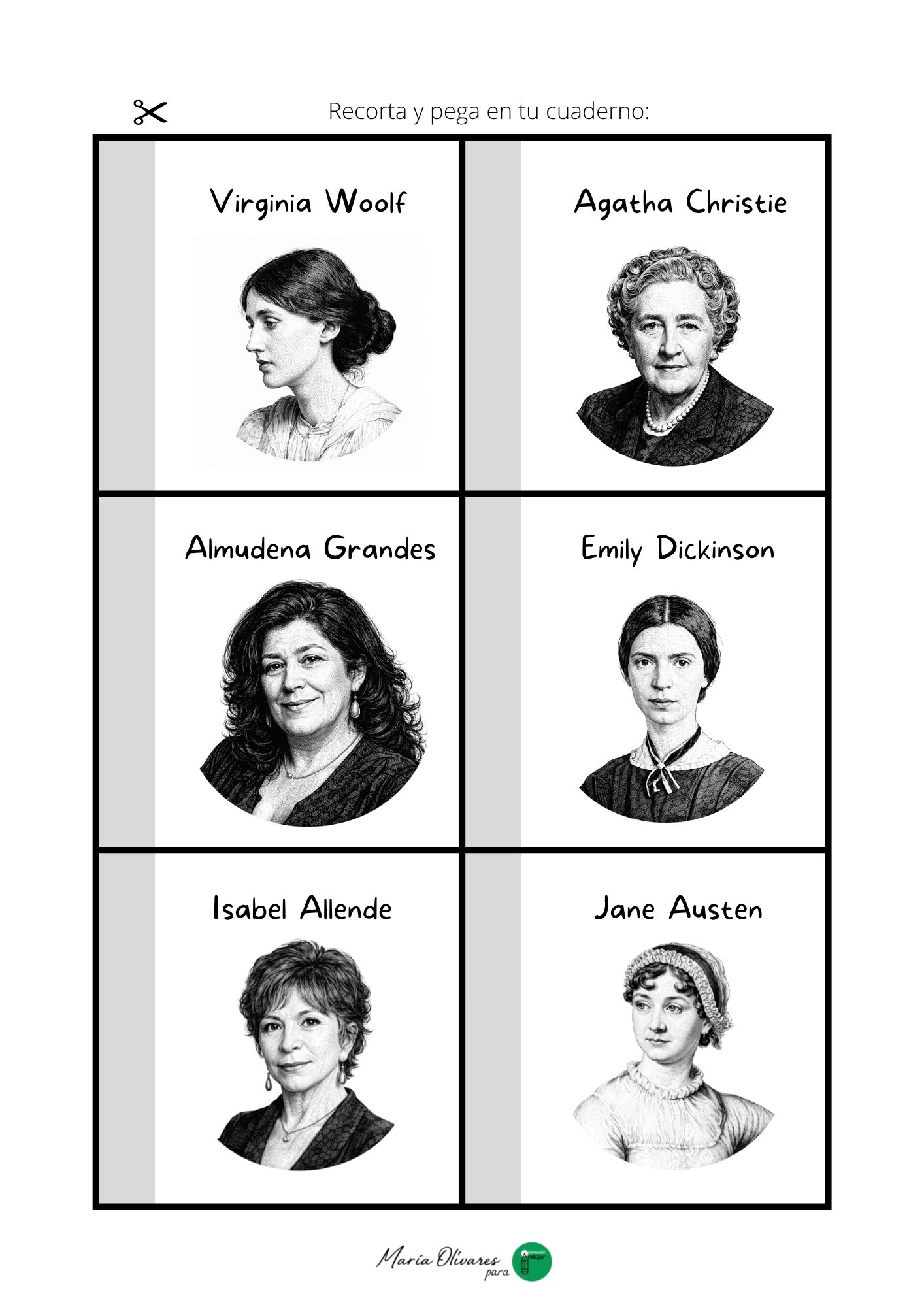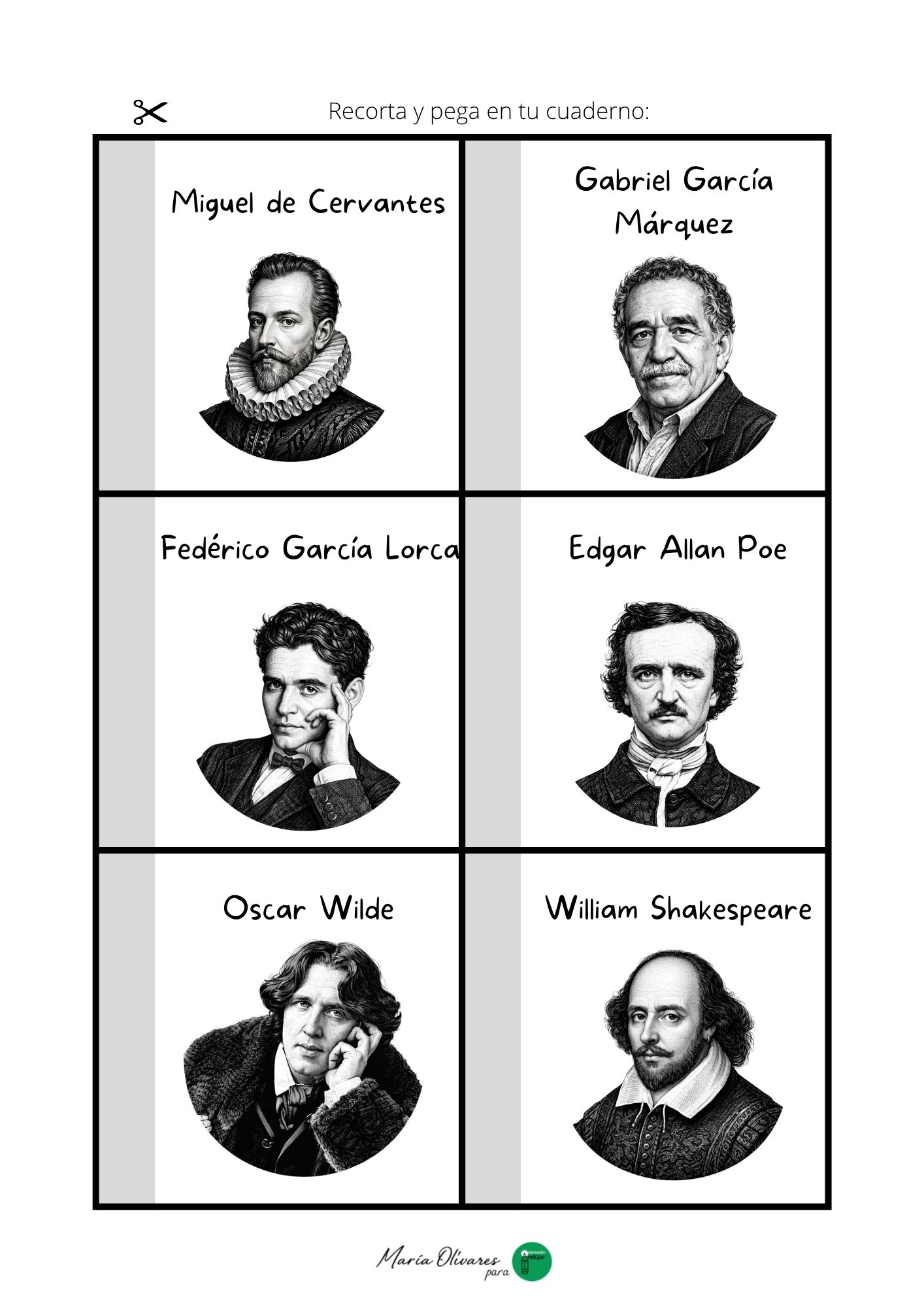Este material no es una ficha convencional; se trata de una serie de plantillas y portadas diseñadas para ser transformadas. Cada plantilla presenta el nombre y la ilustración de un escritor o escritor que ha marcado un hito en la historia. El diseño está pensado para que el alumno recorte la portada, la pegue en su cuaderno de forma estratégica (creando pestañas o solapas) y, bajo cada sección, se convierta en un pequeño investigador que escribe y resume la información más relevante que ha descubierto sobre esa figura histórica.