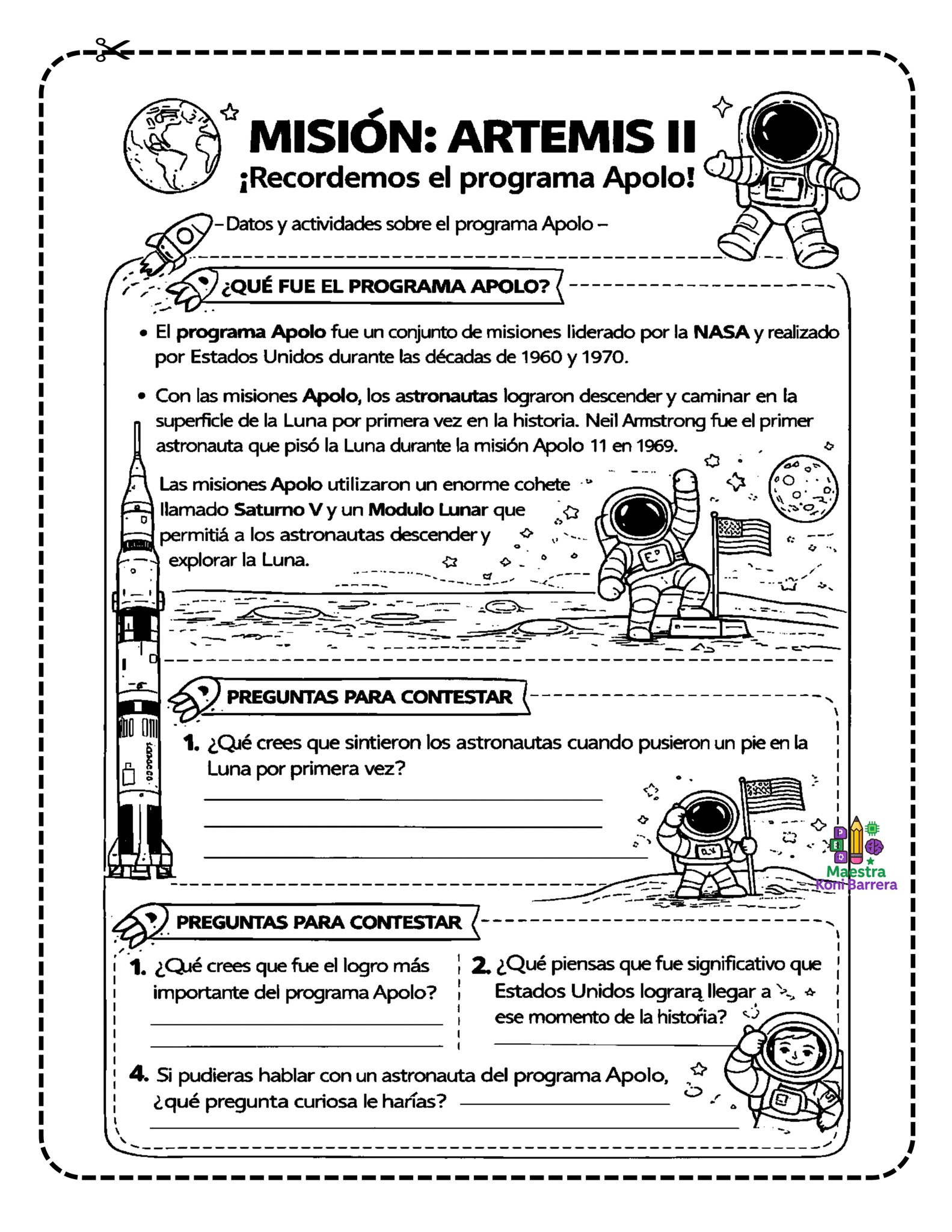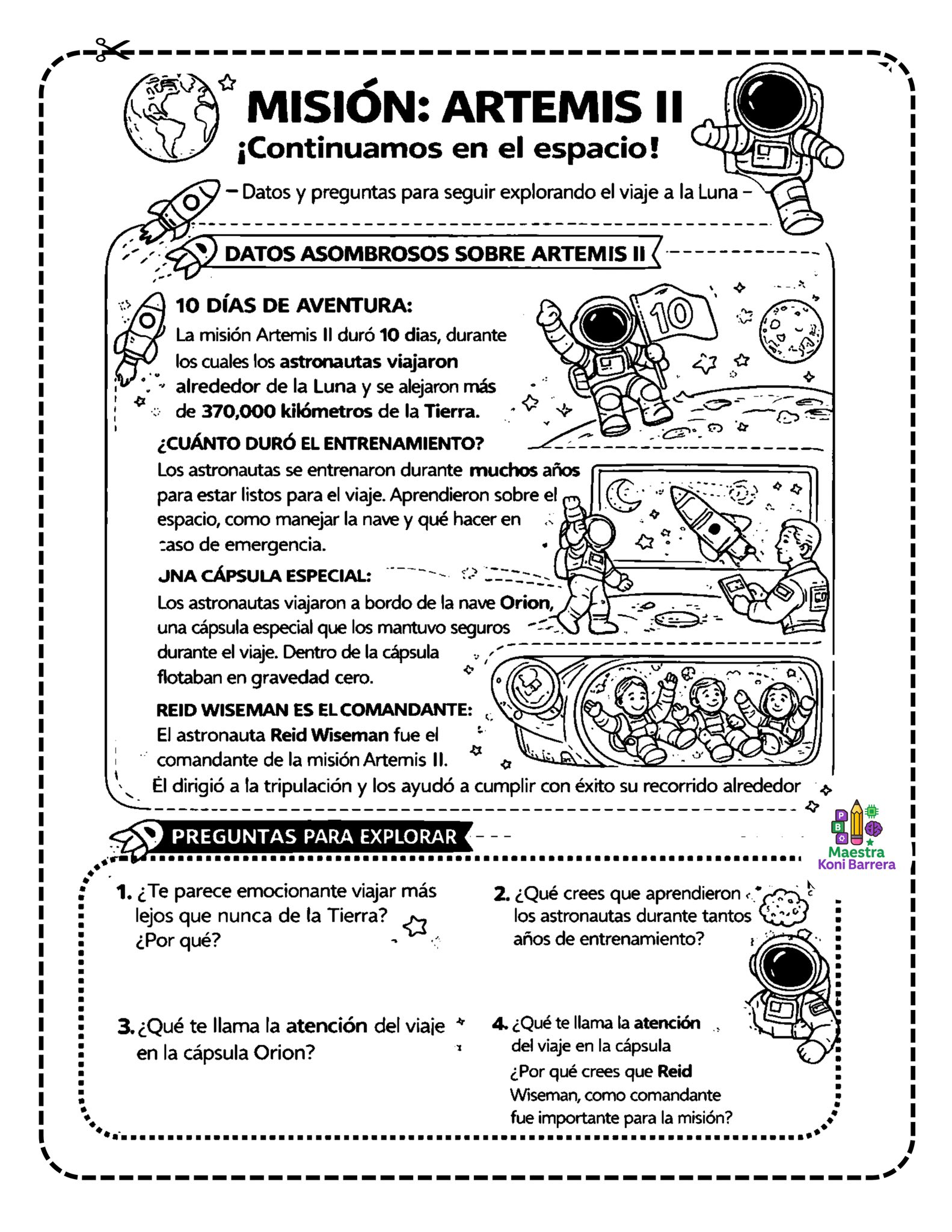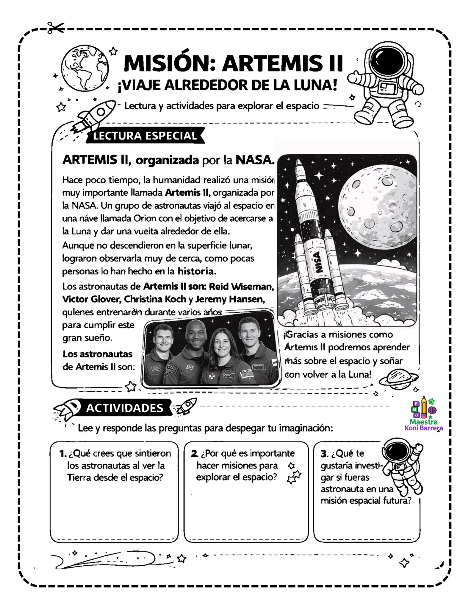 A través de textos breves, ilustraciones y preguntas abiertas, los estudiantes pueden aprender sobre la misión Artemis II, recordar el programa Apolo y explorar cómo se entrena una tripulación espacial.