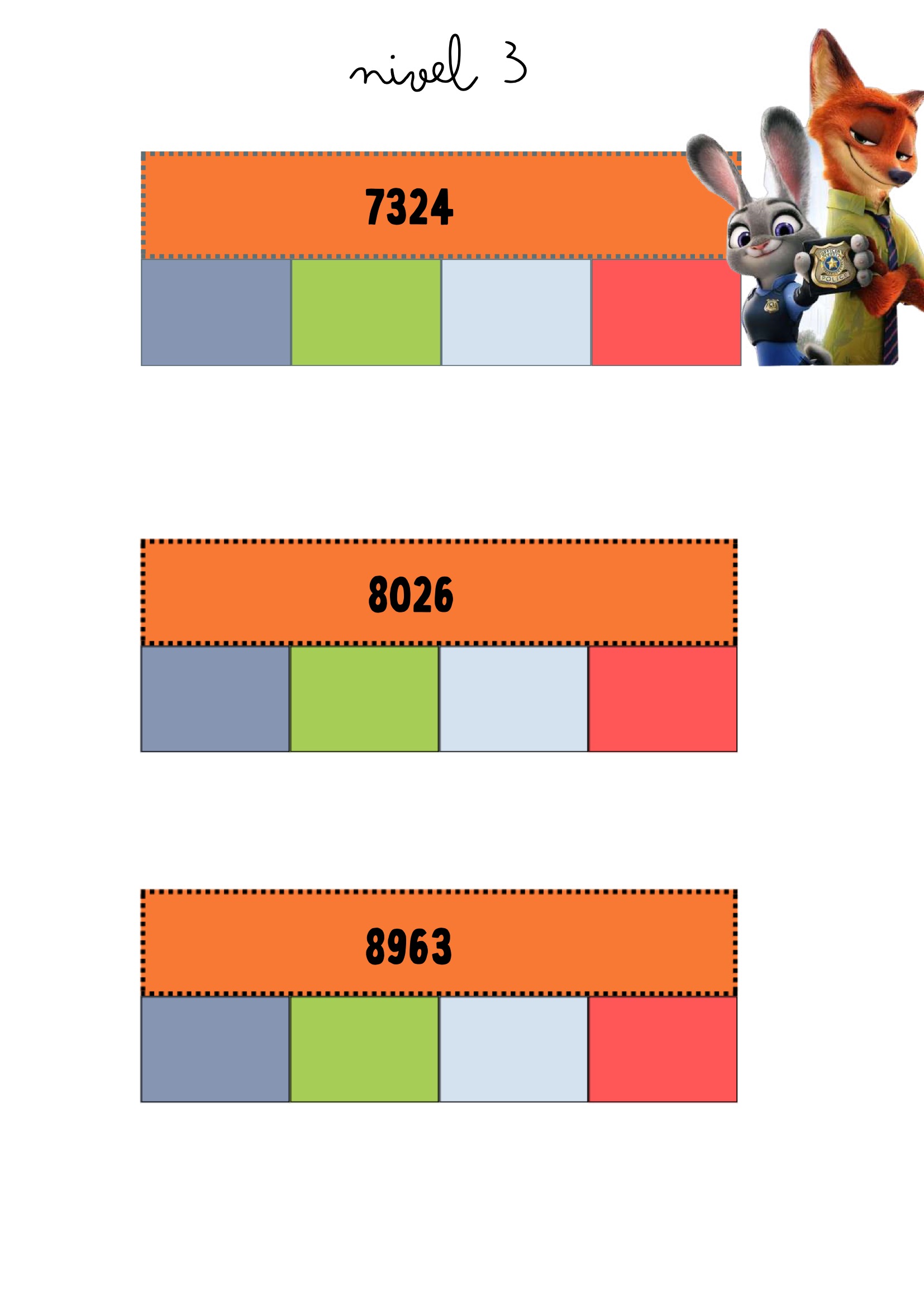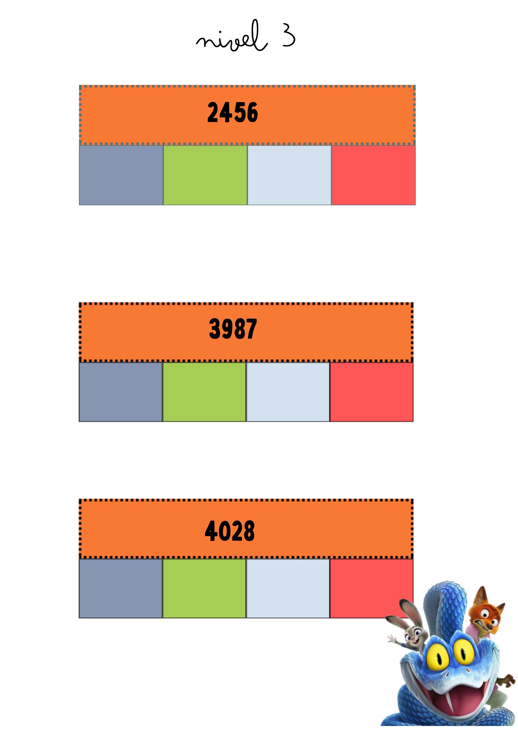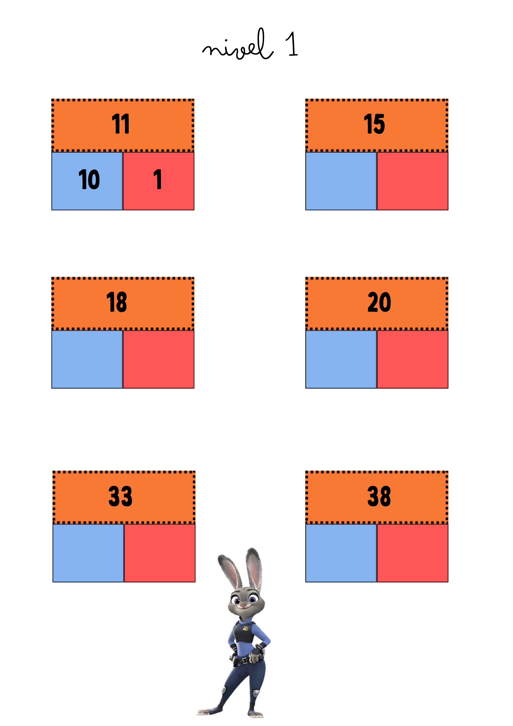 La descomposición numérica es una habilidad clave para comprender cómo están formados los números y para desarrollar estrategias de cálculo mental. Este recurso propone tarjetas visuales protagonizadas por personajes de Zootrópolis, que acompañan al alumnado a través de distintos niveles de dificultad: desde números de dos cifras hasta números de cuatro cifras.