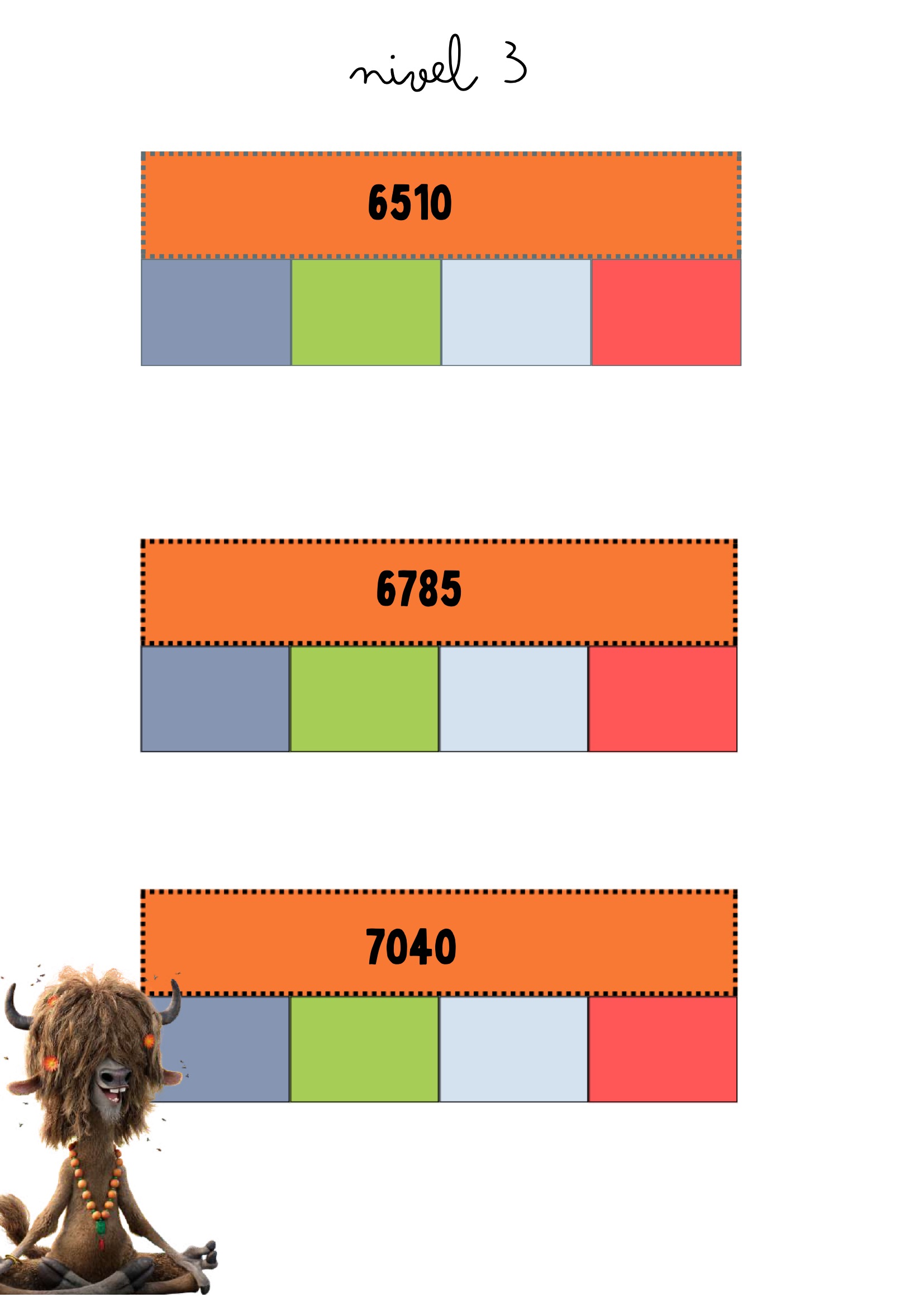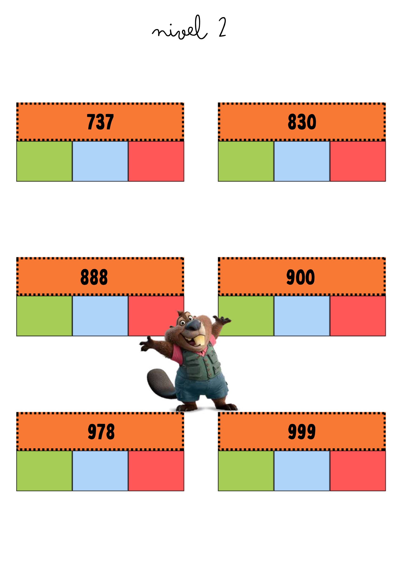Cada tarjeta presenta un número principal y espacios de colores para descomponerlo en unidades, decenas, centenas y unidades de millar, según el nivel. Una forma divertida, visual y muy efectiva de trabajar el valor posicional.