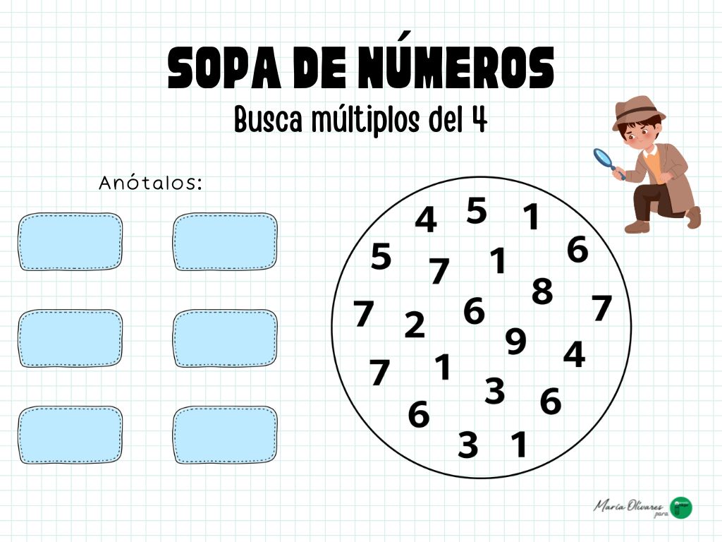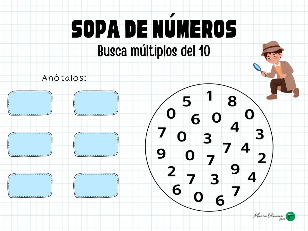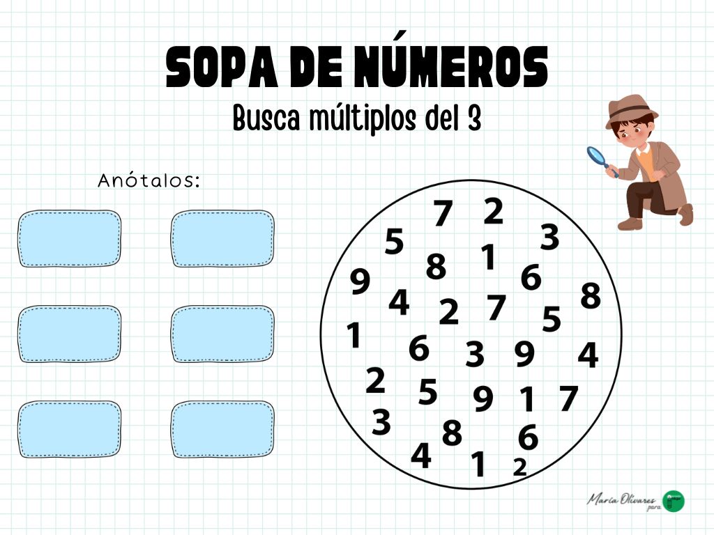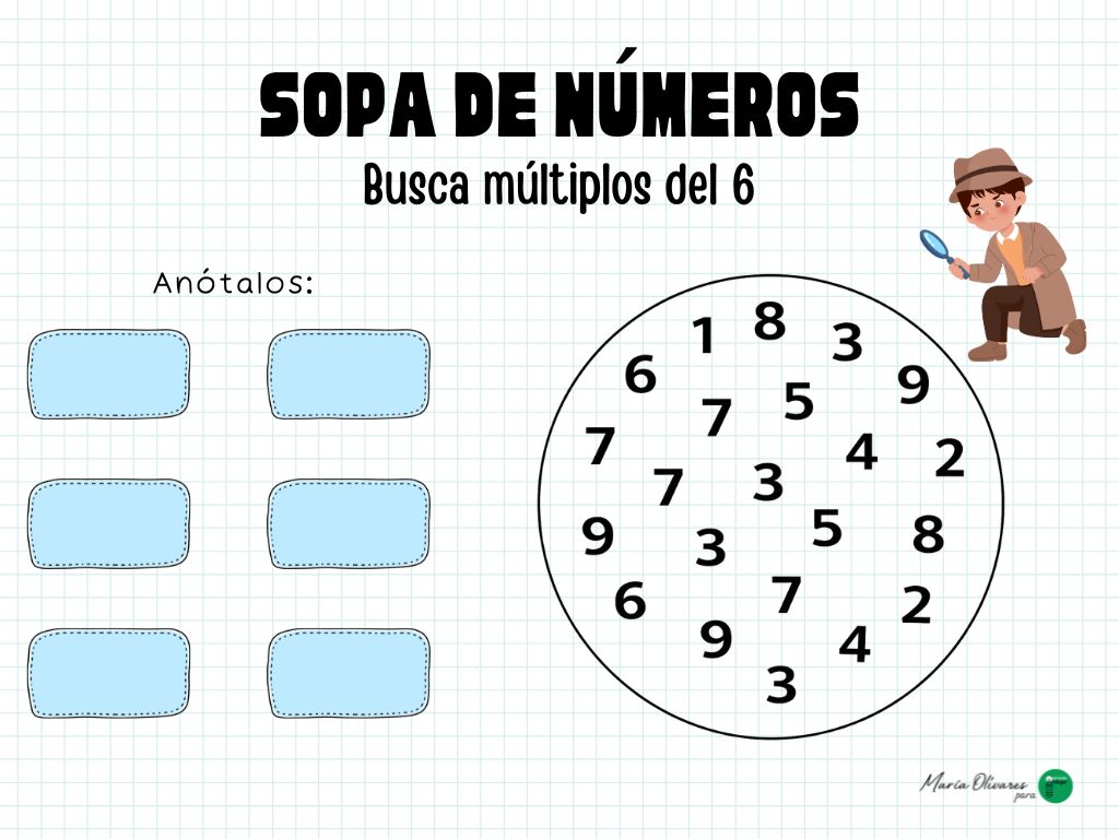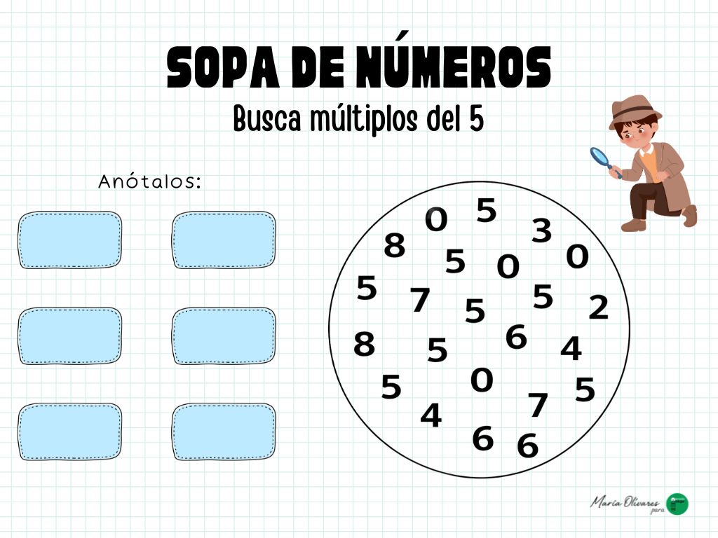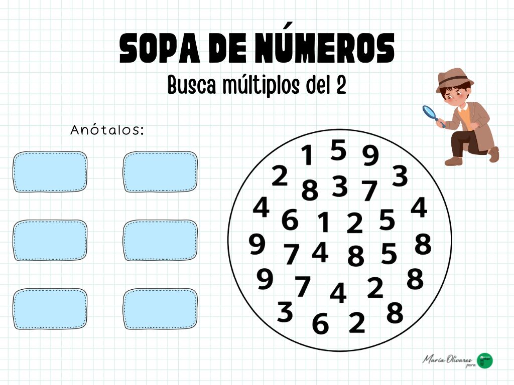 Es una actividad extremadamente original que obliga al cerebro a cambiar el «chip». Ya no estamos ante una tarea de reconocimiento lingüístico, sino ante un ejercicio de agilidad mental y cálculo rápido. El alumno debe repasar mentalmente las tablas de multiplicar o aplicar criterios de divisibilidad mientras escanea las filas y columnas del tablero.