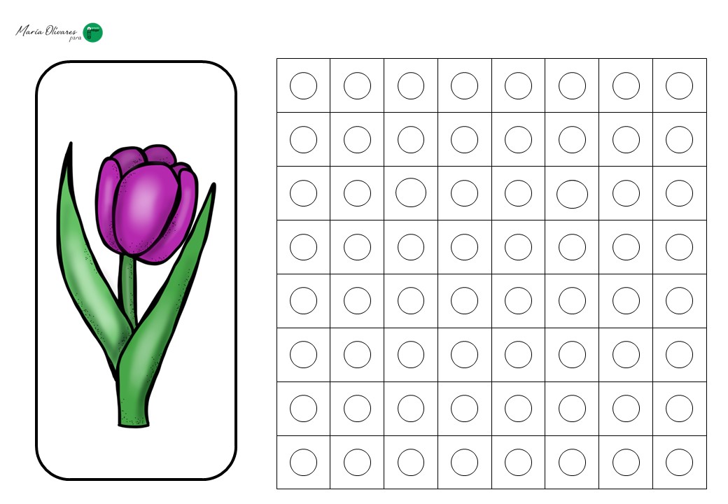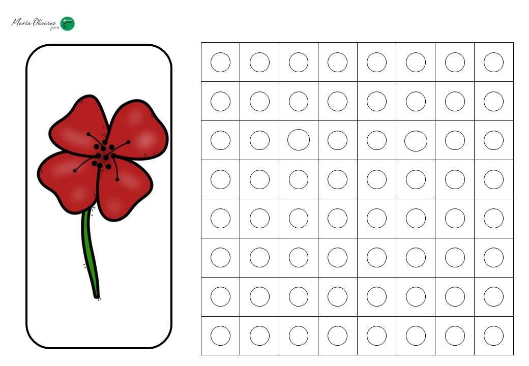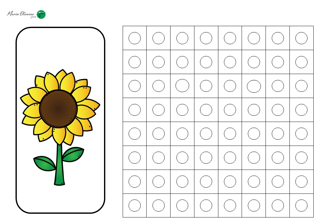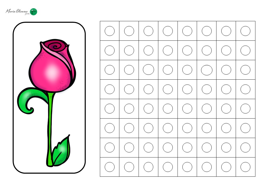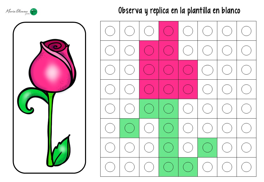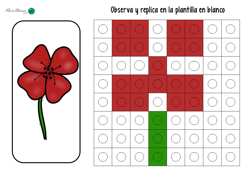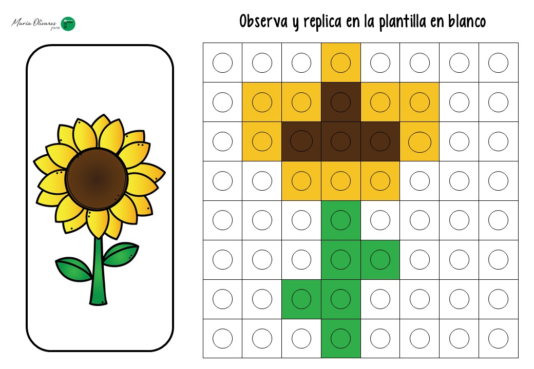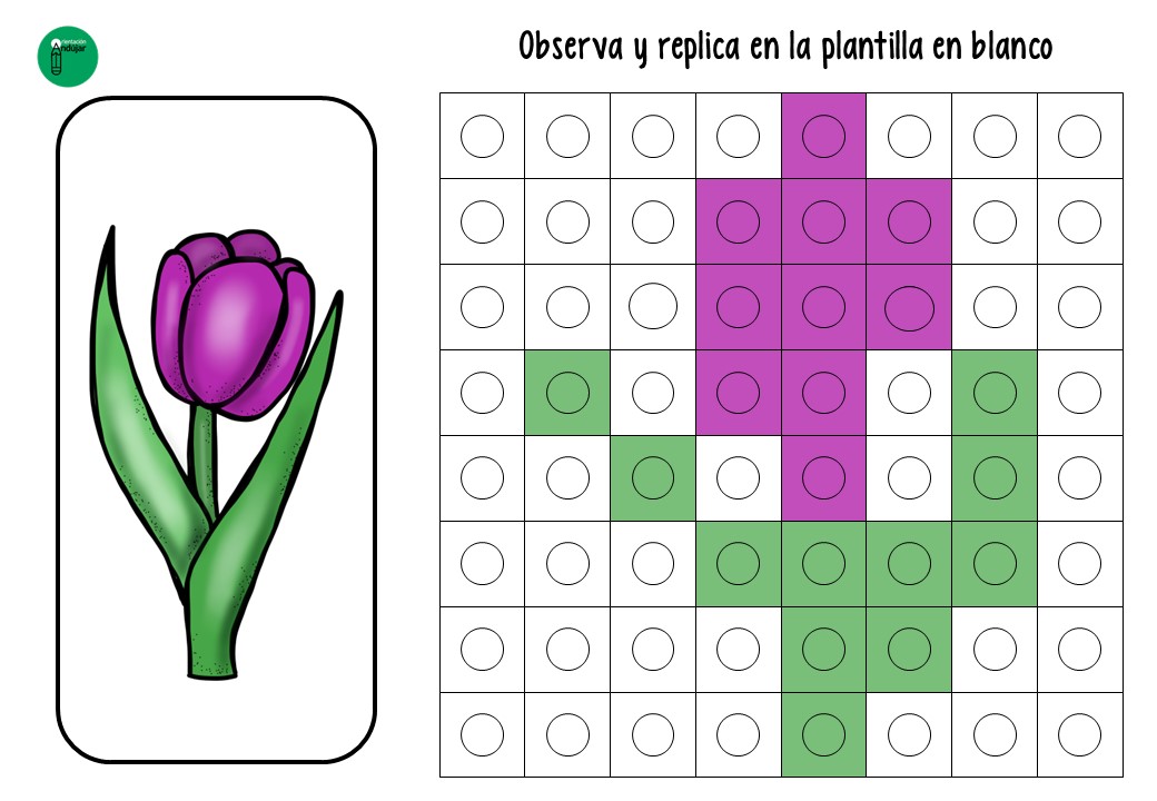 El ejercicio consiste en un juego de réplica. El alumno recibe una tarjeta con un modelo de flor (un tulipán, una margarita o un girasol) construido mediante cuadrados que simulan los policubos. Su misión es doble: primero, debe seleccionar los colores correctos y construir la estructura física; segundo, debe trasladar ese diseño a una plantilla en blanco, coloreando los cuadros correspondientes para «dibujar» la flor en el papel.