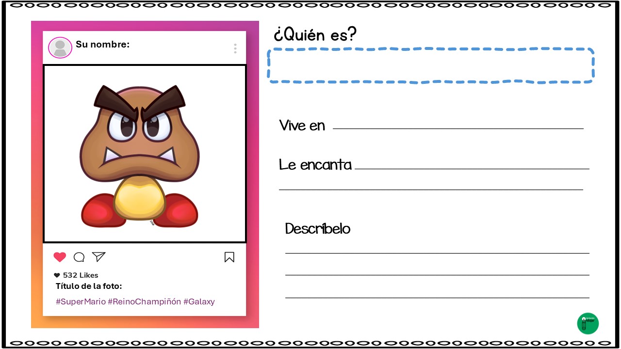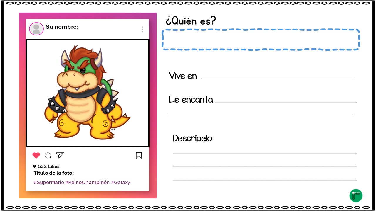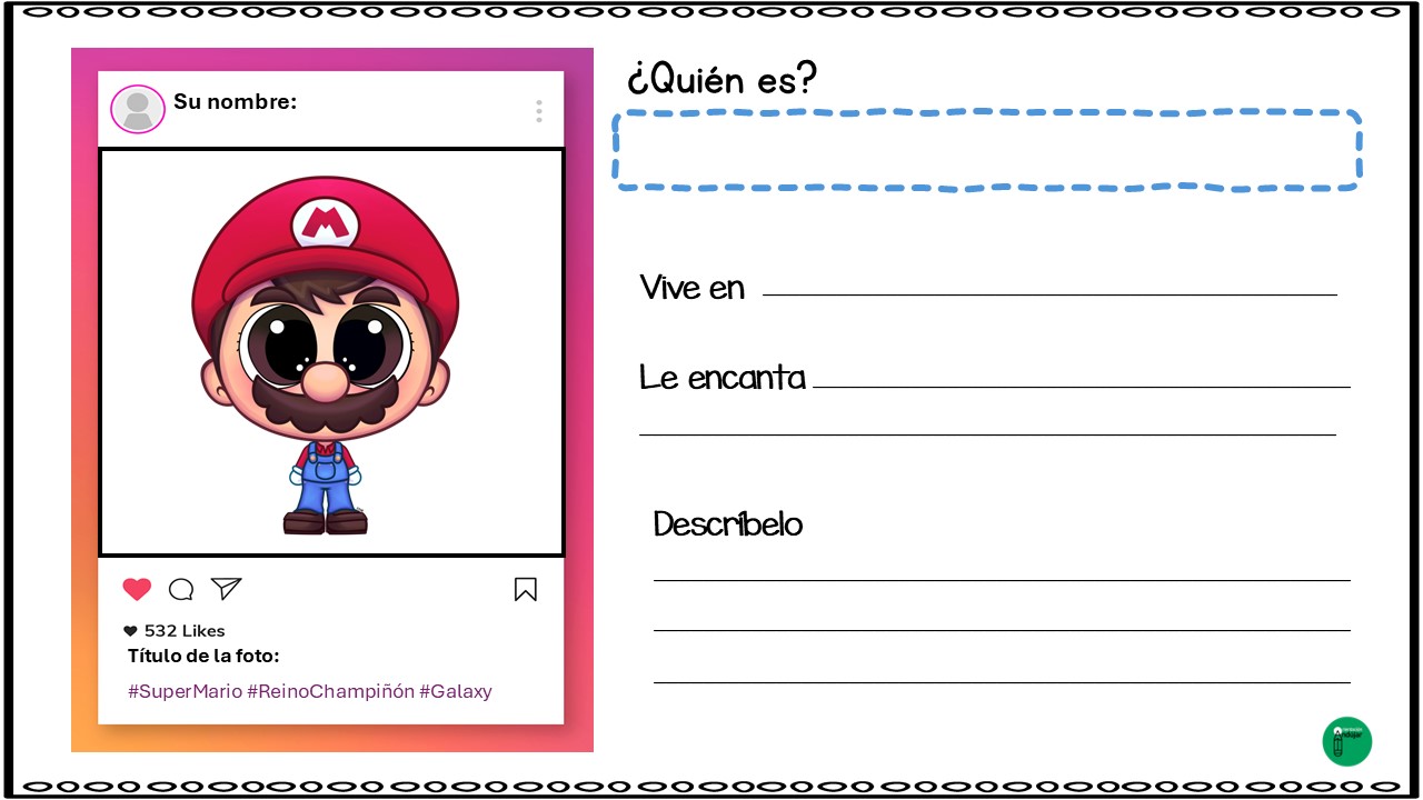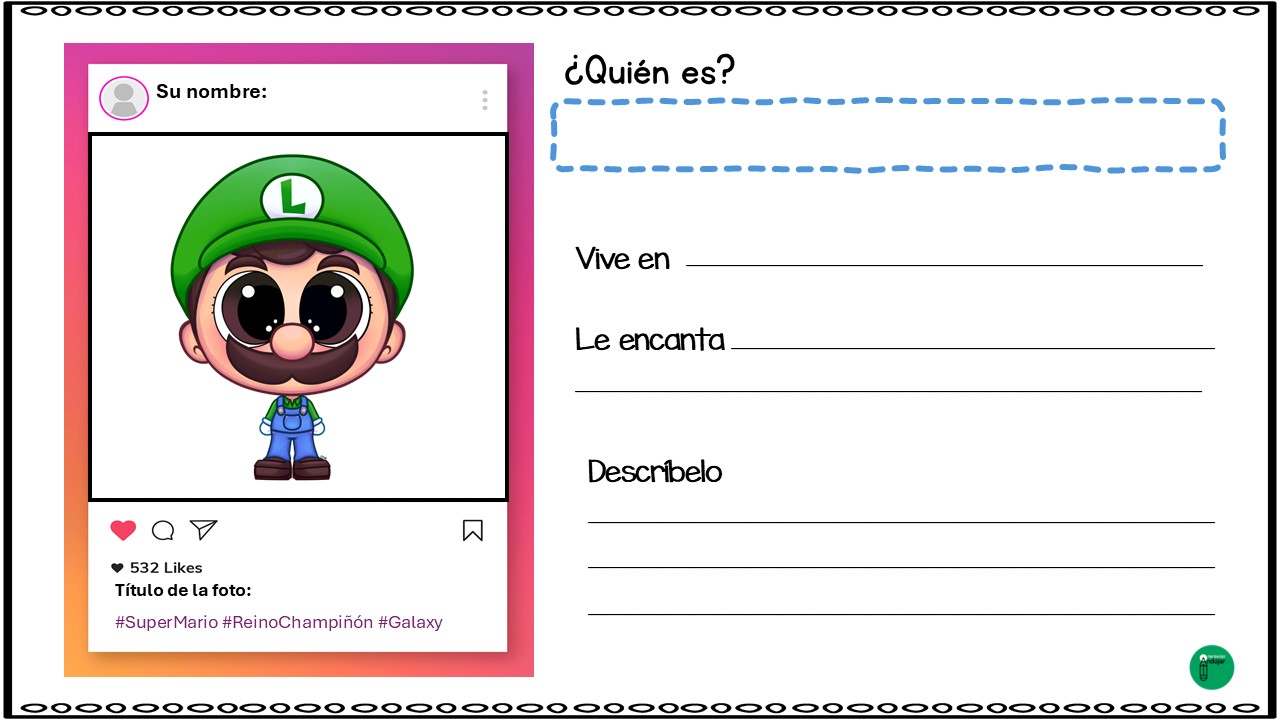 A través de una plantilla que imita la interfaz de esta red social, los alumnos deberán ponerse en la piel de Mario, Luigi, Peach o incluso el mismísimo Bowser para dar vida a su cuenta personal. A partir de la imagen del personaje, el reto consiste en realizar un ejercicio de redacción creativa donde tendrán que pensar un nombre de usuario ingenioso, redactar una biografía atractiva que los describa y escribir «pie de fotos» contando todo lo que sepan sobre sus aventuras, amigos y habilidades. Este diseño tan visual y cercano a su realidad diaria es la excusa perfecta para trabajar la descripción detallada, la coherencia narrativa y la ortografía, sin que sientan que están haciendo una redacción tradicional. Es una dinámica que dispara su imaginación, les motiva a cuidar cada detalle de su escritura y convierte el aula en una verdadera agencia de marketing digital llena de creatividad y diversión.
