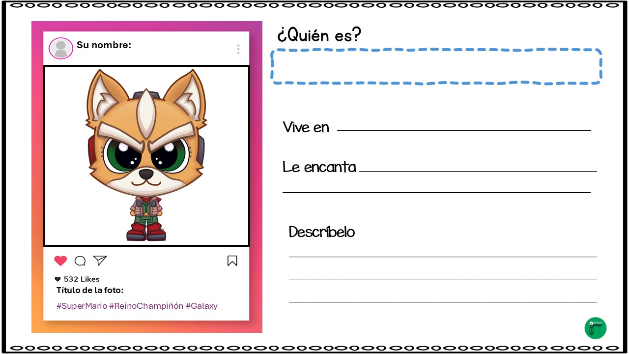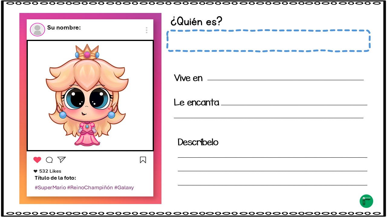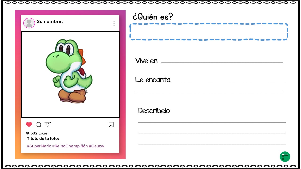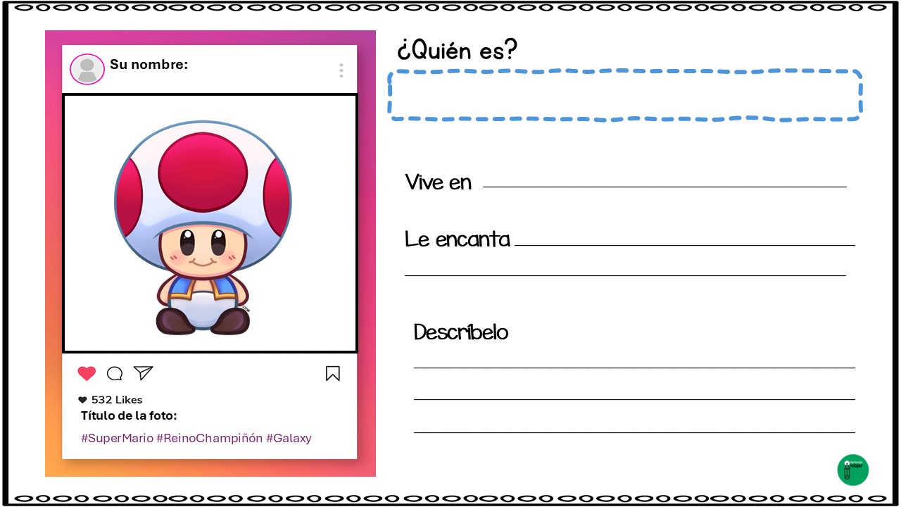 A través de una plantilla que imita la interfaz de esta red social, los alumnos deberán ponerse en la piel de Mario, Luigi, Peach o incluso el mismísimo Bowser para dar vida a su cuenta personal. A partir de la imagen del personaje, el reto consiste en realizar un ejercicio de redacción creativa donde tendrán que pensar un nombre de usuario ingenioso, redactar una biografía atractiva que los describa y escribir «pie de fotos» contando todo lo que sepan sobre sus aventuras, amigos y habilidades. Este diseño tan visual y cercano a su realidad diaria es la excusa perfecta para trabajar la descripción detallada, la coherencia narrativa y la ortografía, sin que sientan que están haciendo una redacción tradicional. Es una dinámica que dispara su imaginación, les motiva a cuidar cada detalle de su escritura y convierte el aula en una verdadera agencia de marketing digital llena de creatividad y diversión.