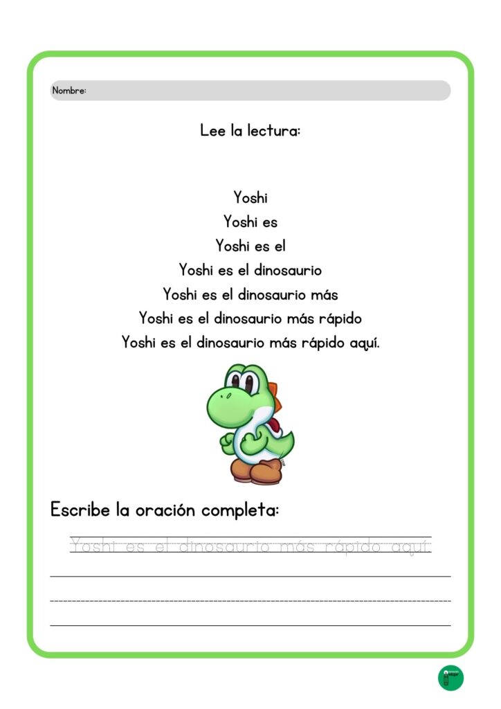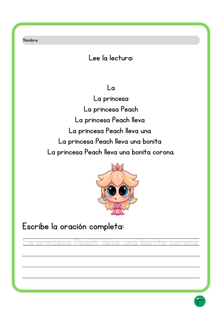 Pero la magia no termina con la lectura. Para consolidar el aprendizaje y trabajar la lectoescritura, una vez que el alumno llega a la base de la pirámide y ha comprendido el significado de la frase, deberá escribir la oración completa en la parte inferior. Es el cierre perfecto: primero entrenamos el ojo y el oído con la lectura graduada, y luego fijamos la estructura gramatical y la grafía con la escritura.