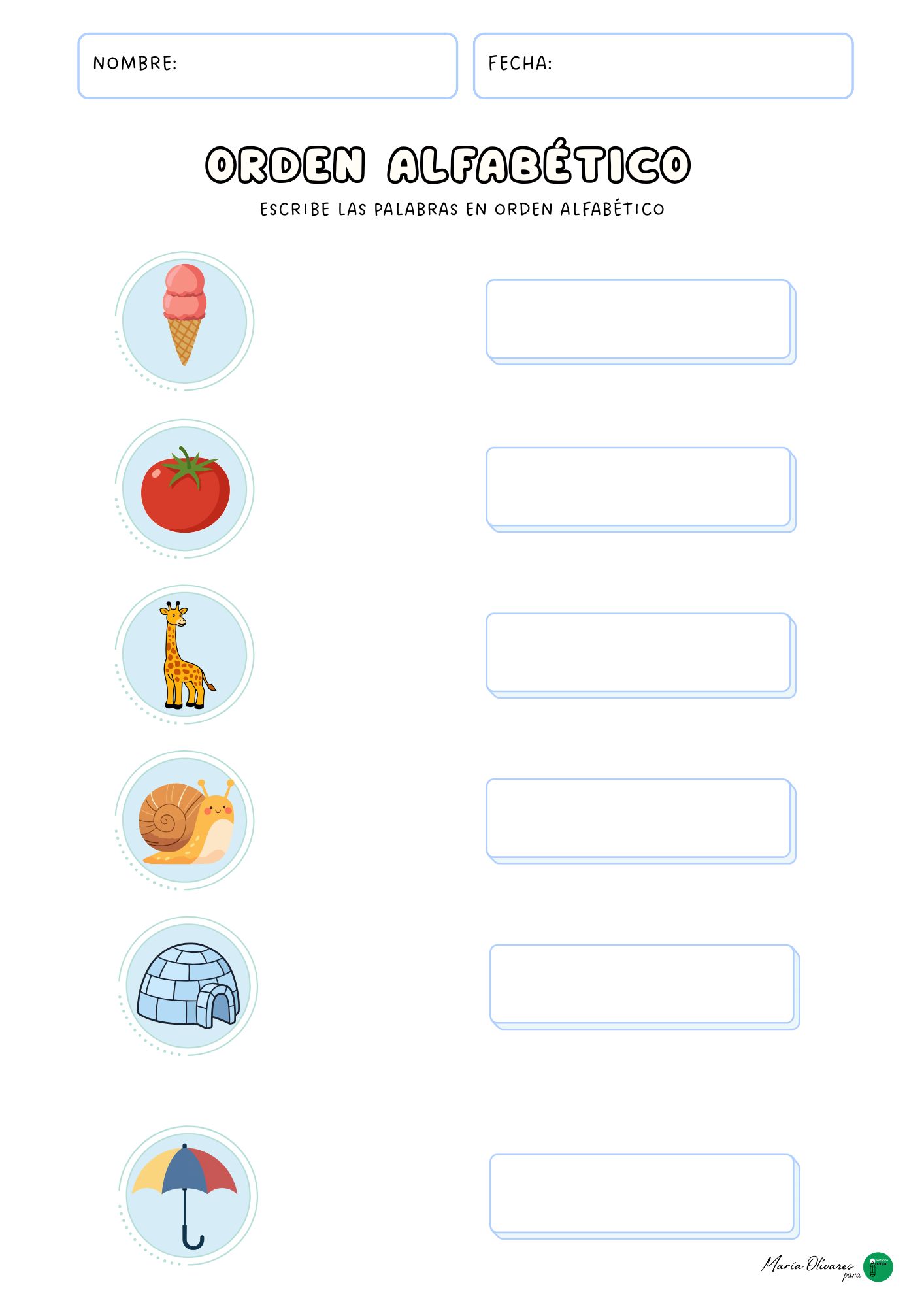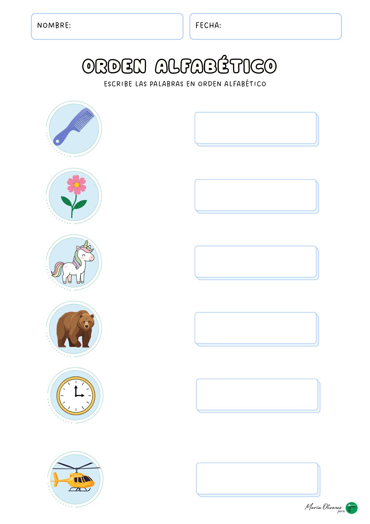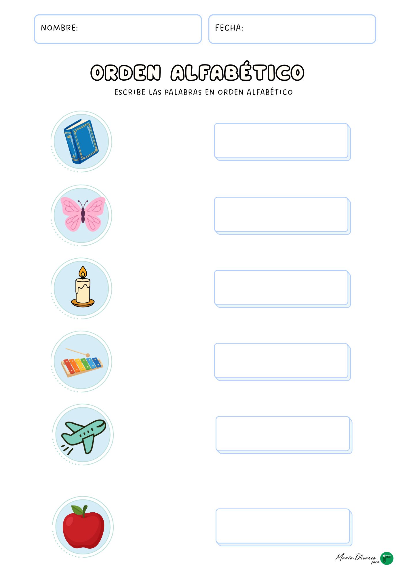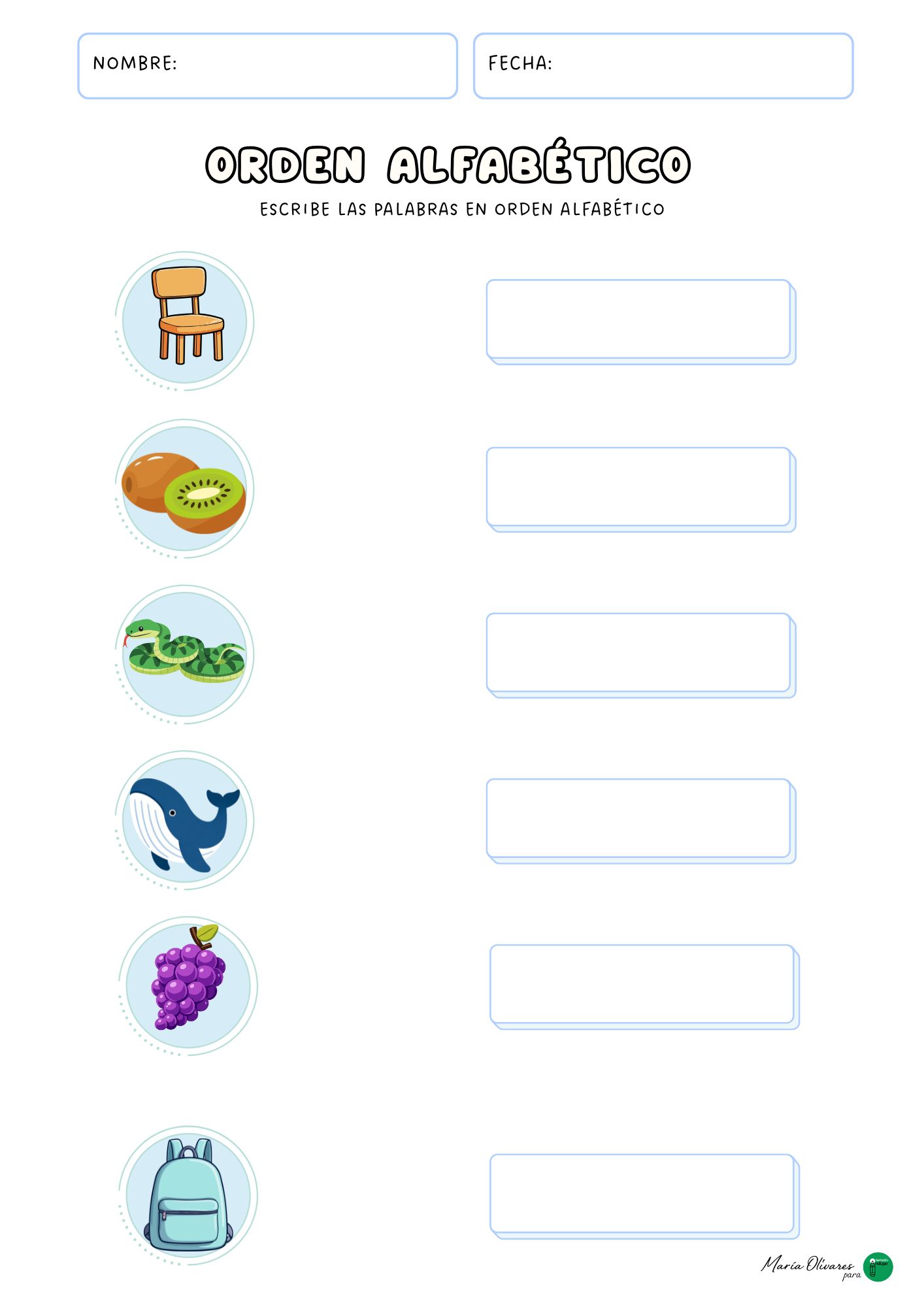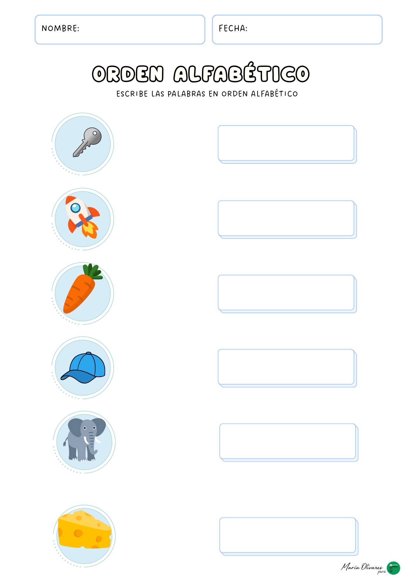 En estas fichas, los alumnos encontrarán una serie de ilustraciones de objetos, animales o elementos cotidianos. El reto es doble: primero, deben identificar el nombre de la imagen (trabajando así el vocabulario) y, después, analizar la letra inicial para decidir en qué posición deben colocarla dentro de su lista. Esta transición de lo visual a lo alfabético ayuda a que el proceso mental sea mucho más consciente y menos automático, reforzando la lectoescritura de una forma lúdica.