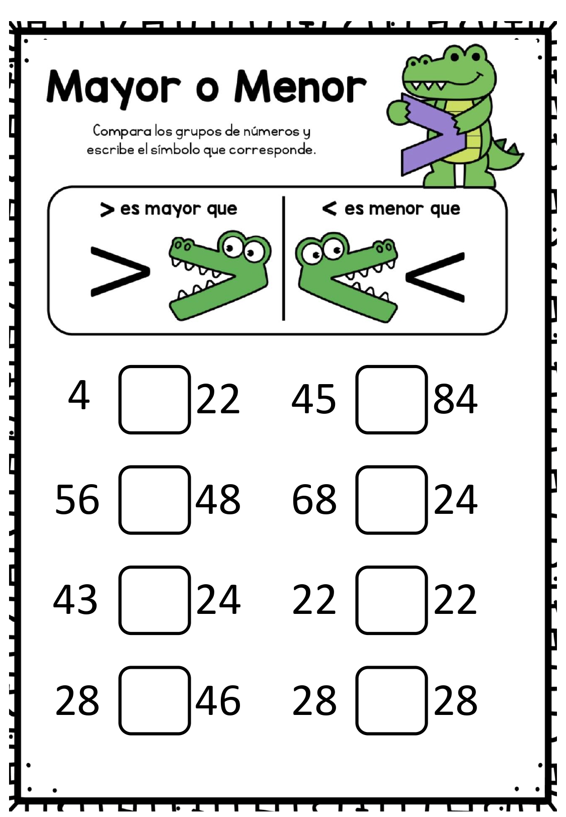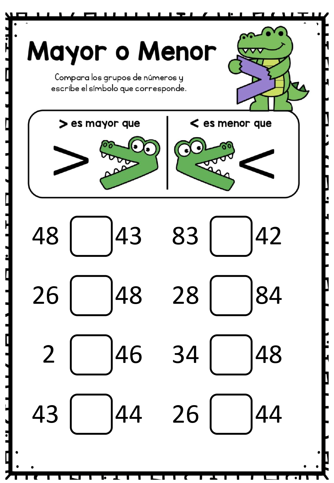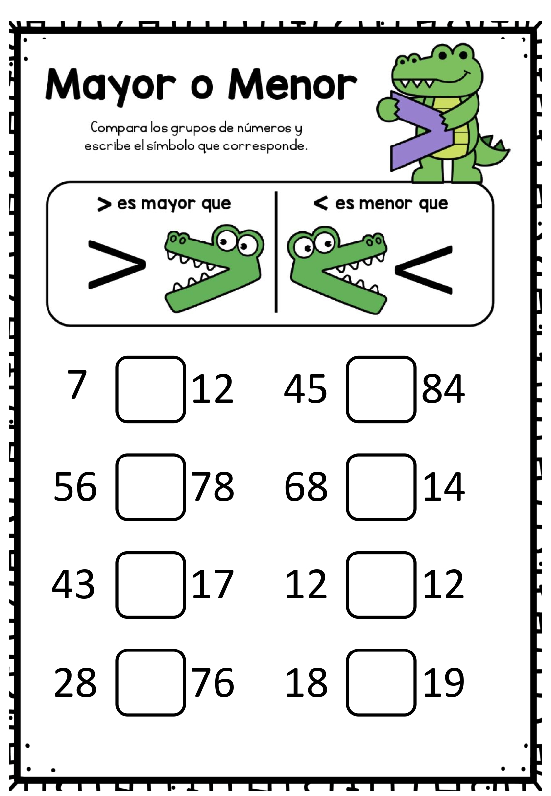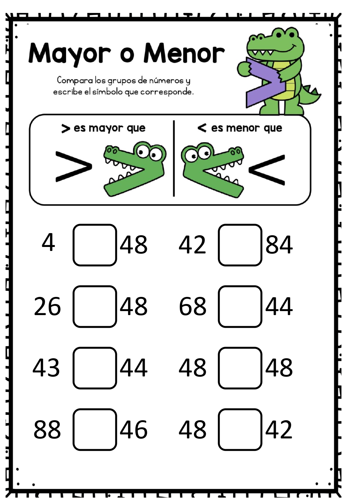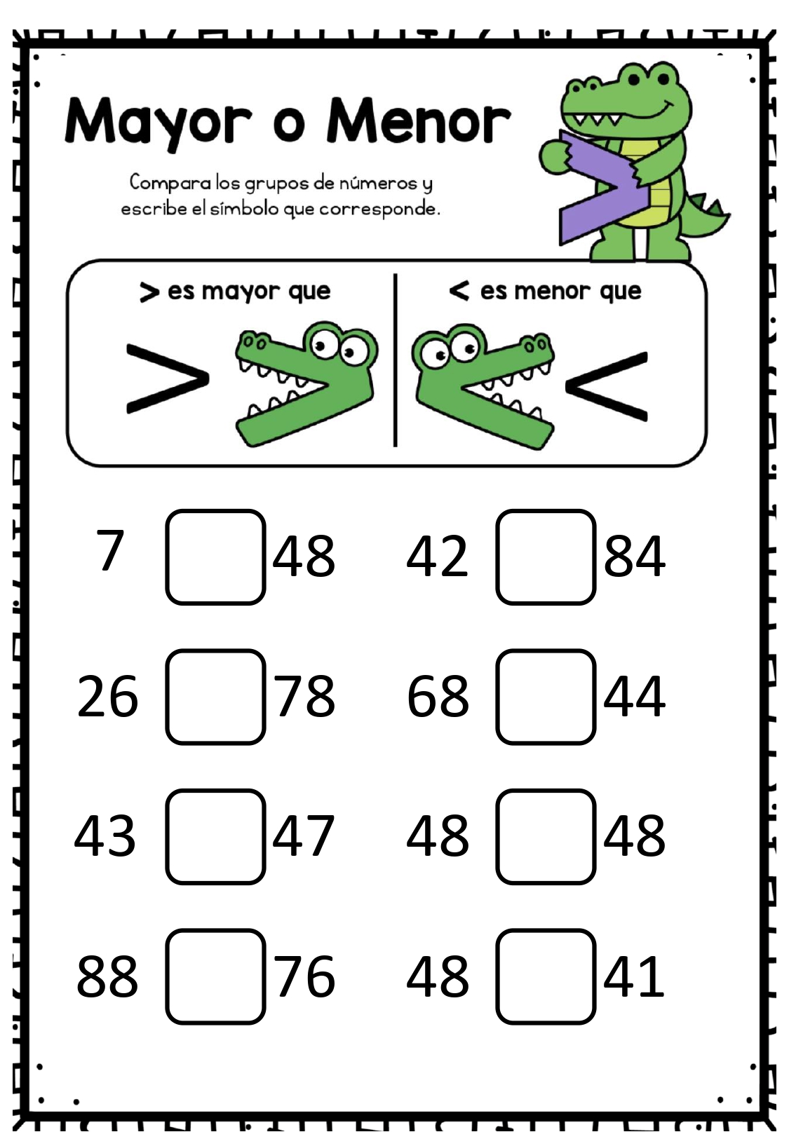 El recurso incluye fichas variadas donde los niños y niñas deben comparar pares de números y completar el espacio con el símbolo correcto: > mayor que, < menor que o = igual que.