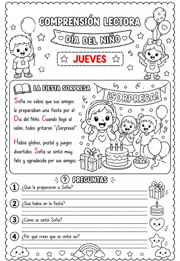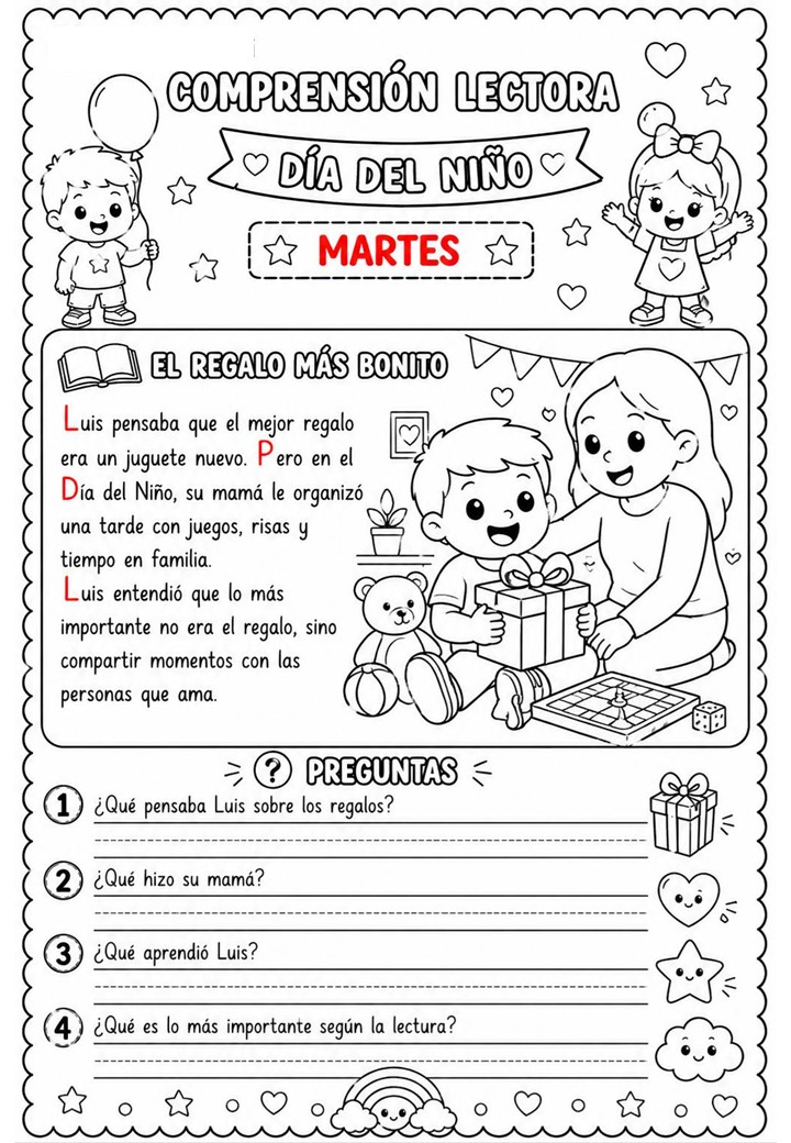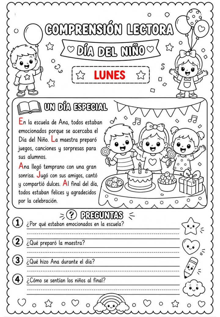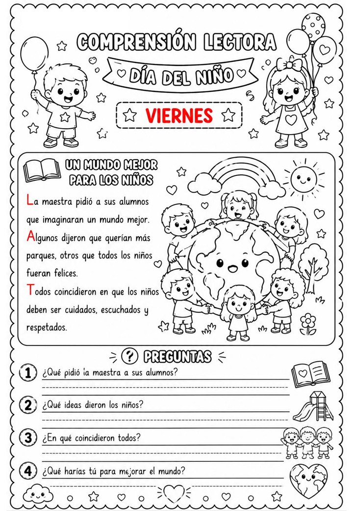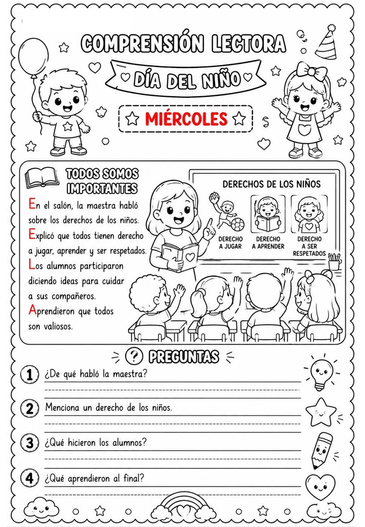 La Semana del Niño y la Niña es una ocasión maravillosa para trabajar valores, emociones, derechos y convivencia a través de actividades significativas. Este recurso de comprensión lectora está diseñado para acompañar cada día con una lectura breve, cercana y adaptada a los niveles iniciales de Primaria.