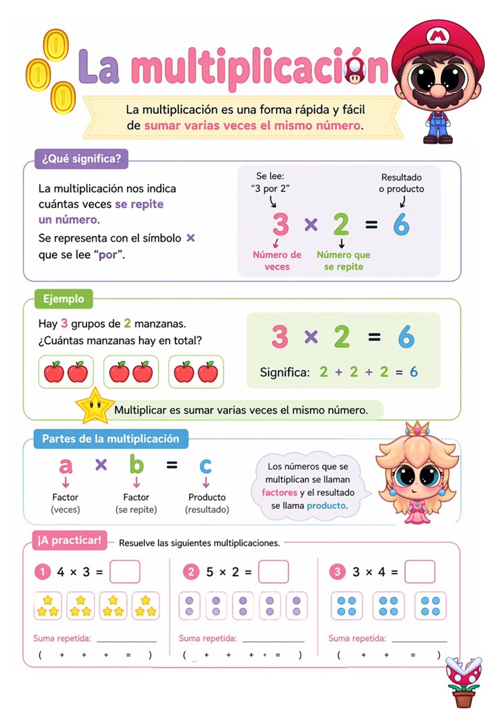 La multiplicación es uno de los contenidos clave de Primaria, pero también uno de los que más dudas genera al principio. Para ayudar al alumnado a comprenderla de manera sencilla, visual y motivadora, esta lámina didáctica de Super Mario explica paso a paso qué es multiplicar, cómo se representa y cómo se relaciona con la suma repetida.