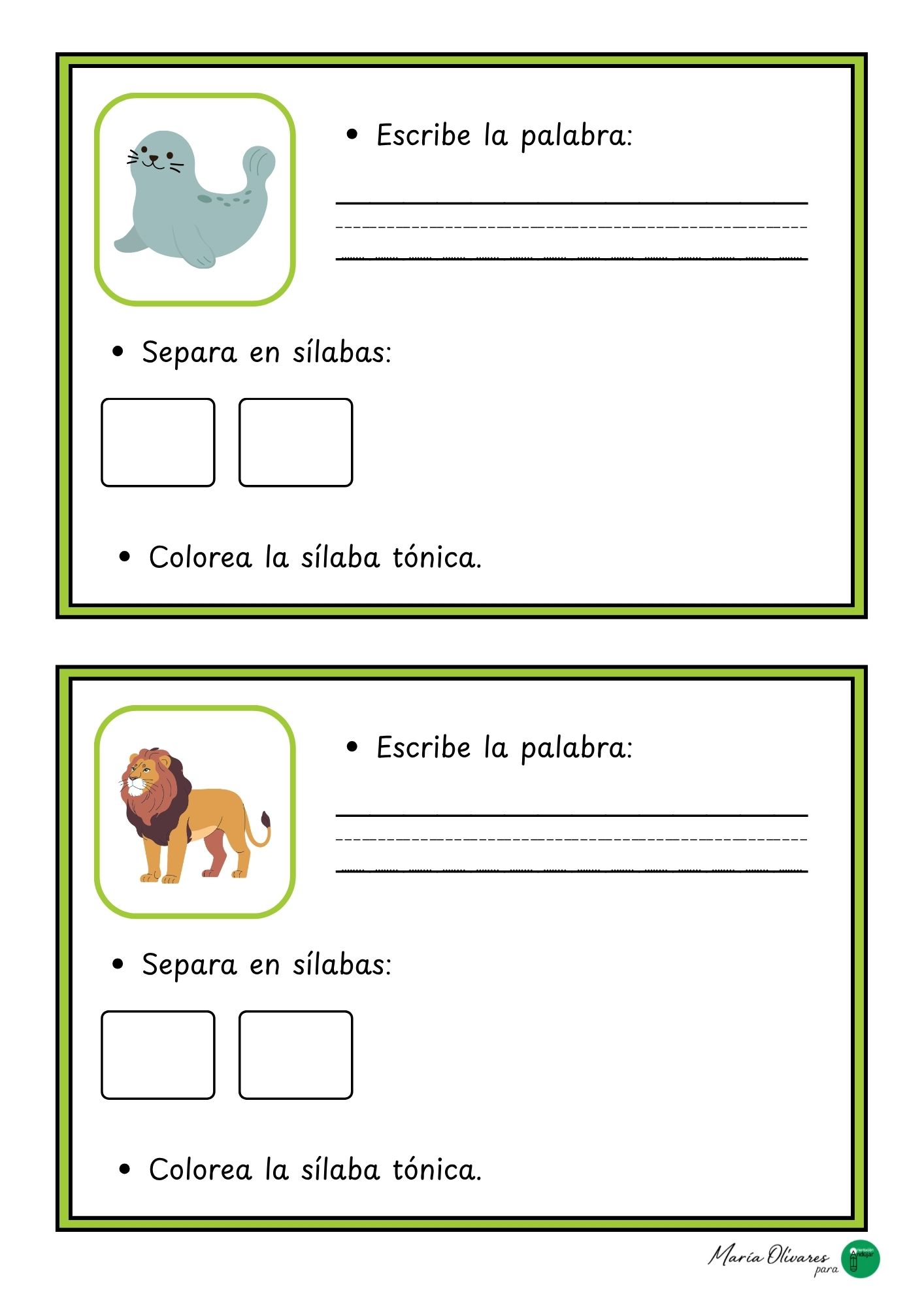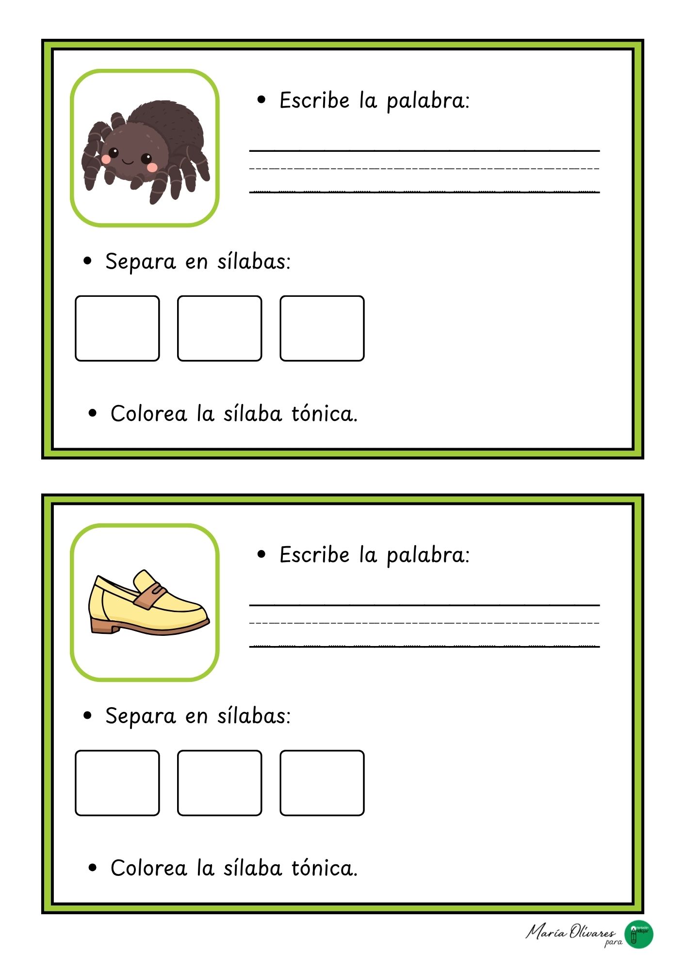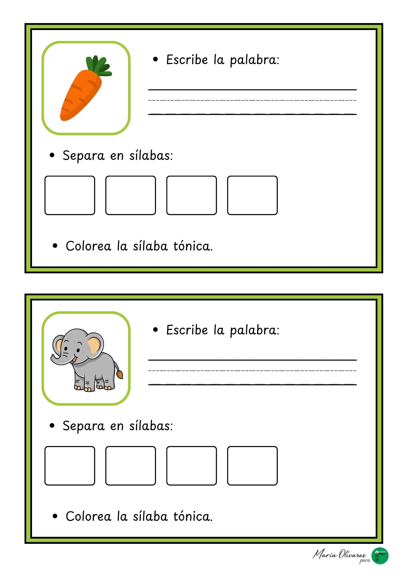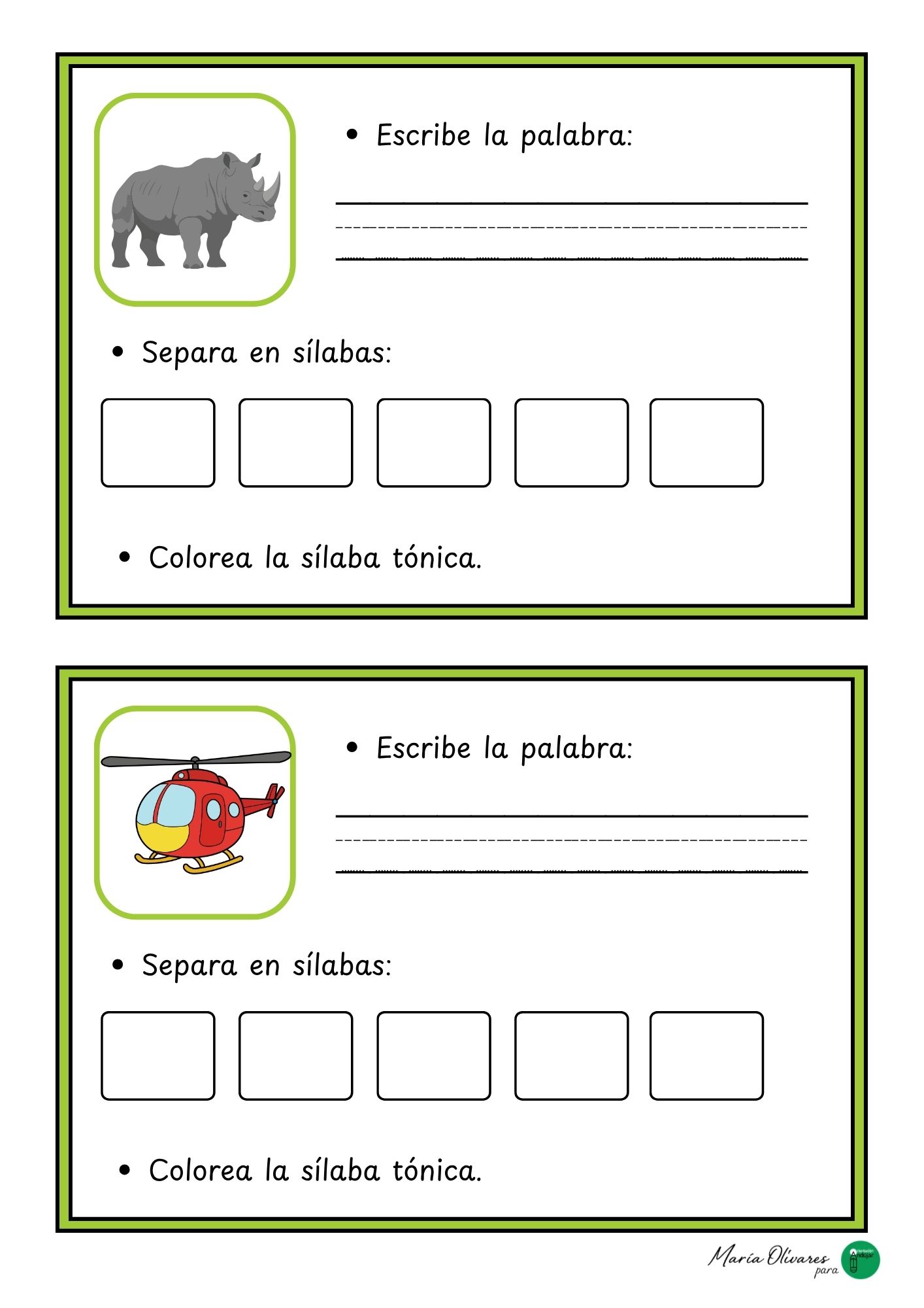 Este recurso está diseñado para fortalecer la conciencia silábica, un pilar fundamental en el proceso de lectoescritura. El material consiste en una serie de tarjetas interactivas donde, a partir de una imagen clara y atractiva, el alumno debe realizar un análisis completo de la palabra. El ejercicio sigue una secuencia lógica: primero, el estudiante identifica el objeto y escribe su nombre; después, debe segmentar la palabra correctamente separándola en sílabas y, finalmente, colorear o marcar los círculos que representan cada golpe de voz para trabajar la estructura rítmica. Para ofrecer un reto progresivo, la colección incluye palabras de diferentes extensiones, desde estructuras sencillas de dos sílabas hasta términos más complejos de cinco sílabas. Es un material ideal para que los niños visualicen la composición de las palabras, comprendan su longitud y mejoren tanto su ortografía como su capacidad de segmentación fonológica de una forma muy visual y práctica.