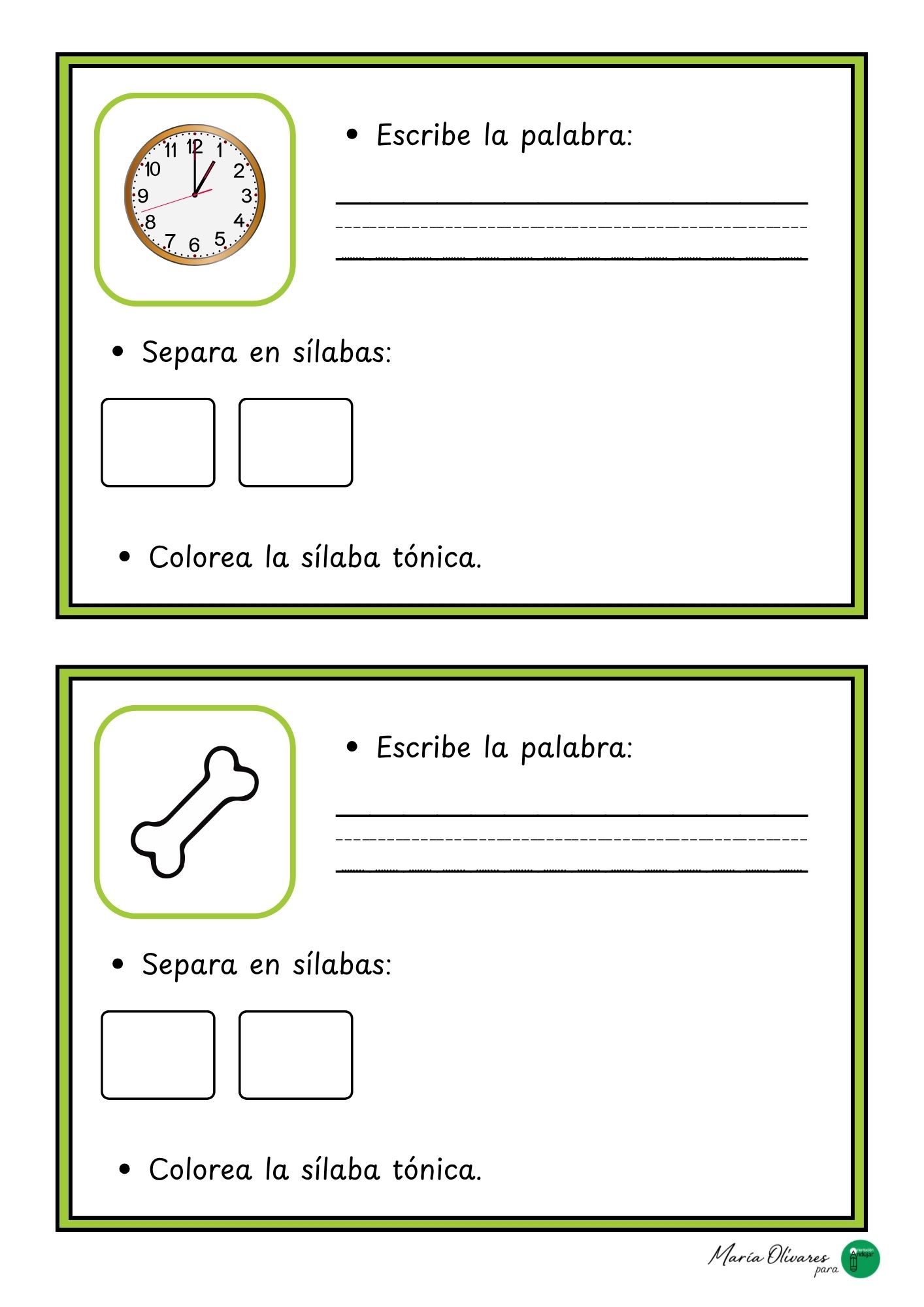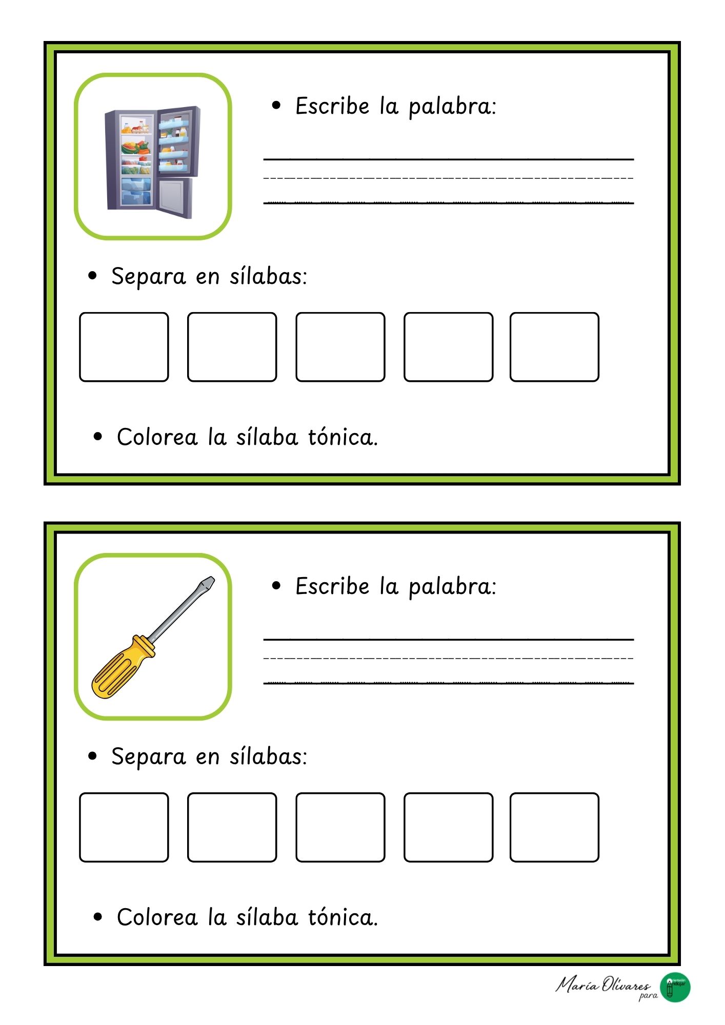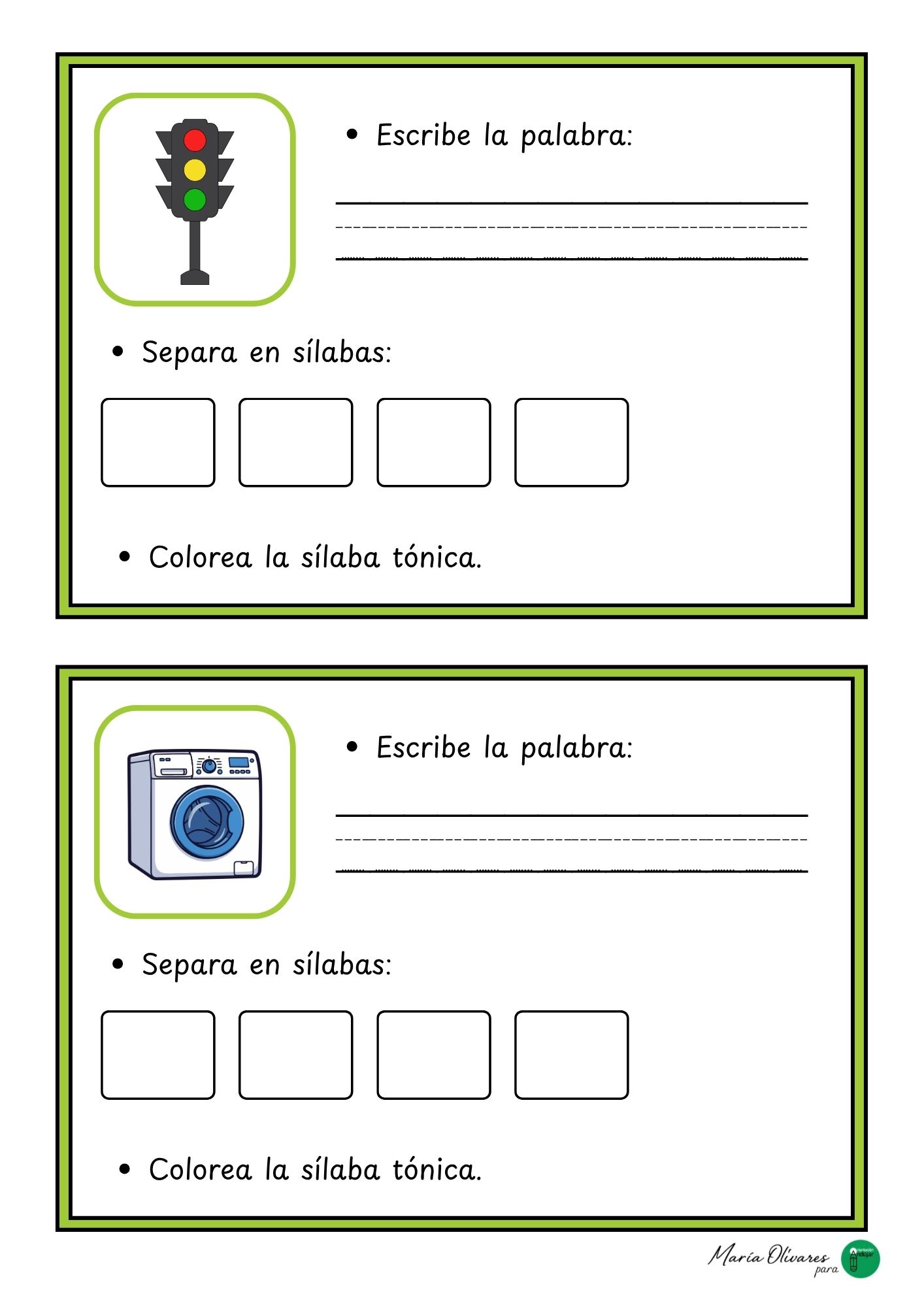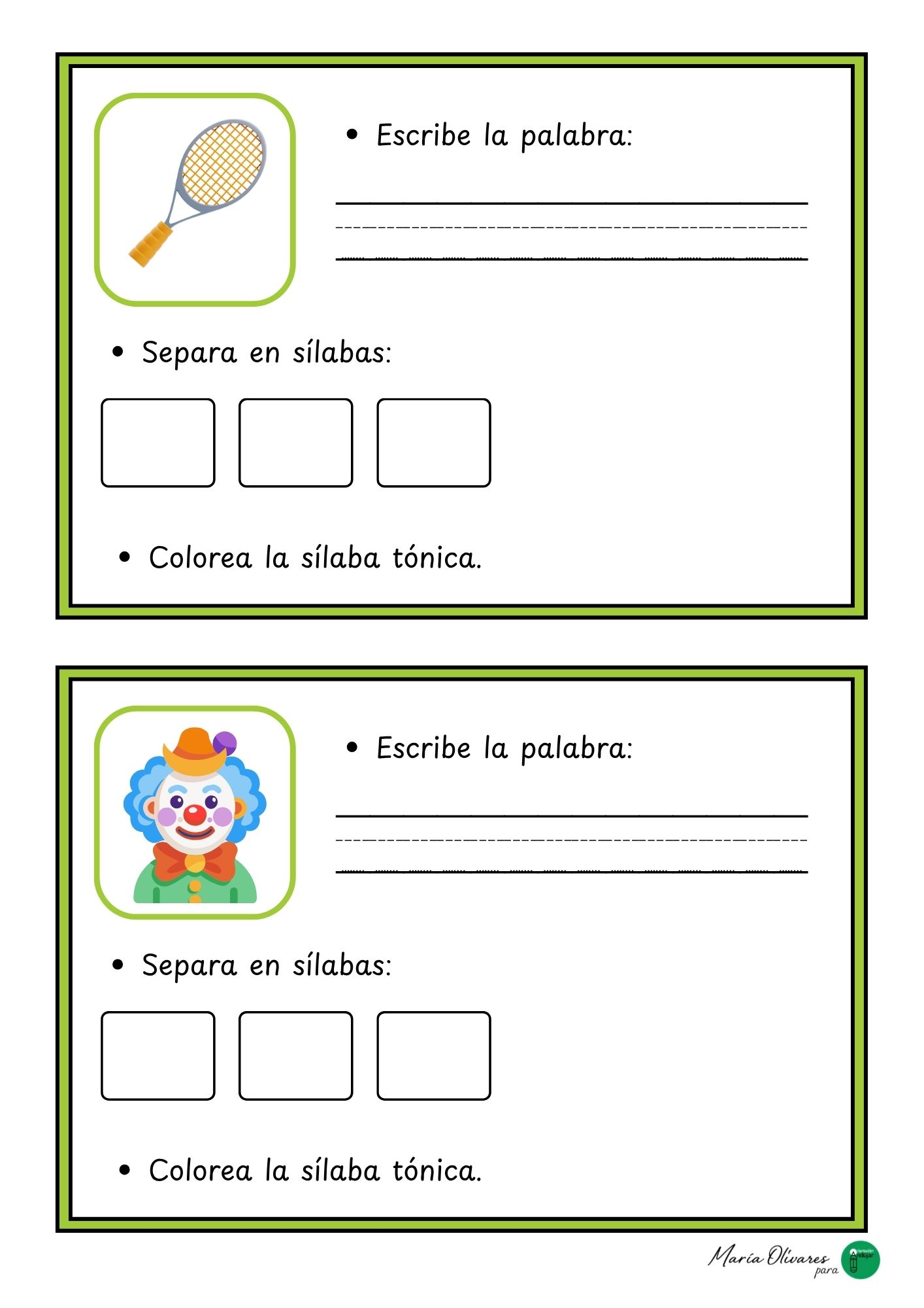 Este recurso está diseñado para fortalecer la conciencia silábica, un pilar fundamental en el proceso de lectoescritura. El material consiste en una serie de tarjetas interactivas donde, a partir de una imagen clara y atractiva, el alumno debe realizar un análisis completo de la palabra. El ejercicio sigue una secuencia lógica: primero, el estudiante identifica el objeto y escribe su nombre; después, debe segmentar la palabra correctamente separándola en sílabas y, finalmente, colorear o marcar los círculos que representan cada golpe de voz para trabajar la estructura rítmica. Para ofrecer un reto progresivo, la colección incluye palabras de diferentes extensiones, desde estructuras sencillas de dos sílabas hasta términos más complejos de cinco sílabas. Es un material ideal para que los niños visualicen la composición de las palabras, comprendan su longitud y mejoren tanto su ortografía como su capacidad de segmentación fonológica de una forma muy visual y práctica.