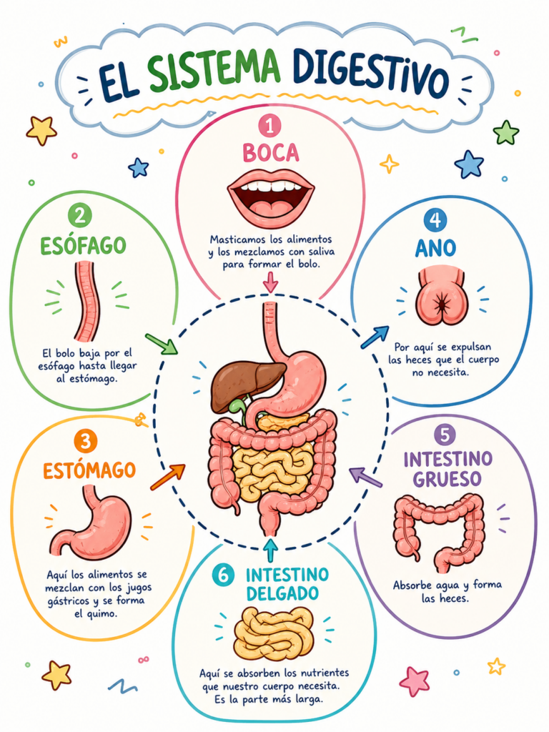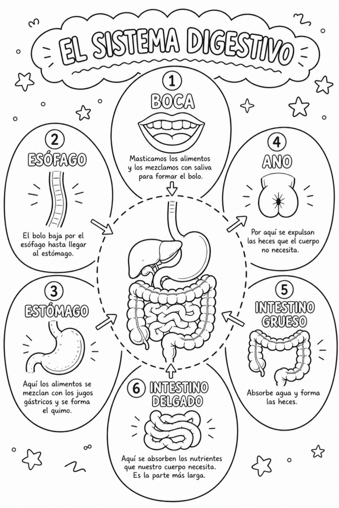 El sistema digestivo es uno de los contenidos más interesantes para trabajar en Infantil y Primaria. Los niños y niñas sienten mucha curiosidad por saber qué ocurre con los alimentos después de comerlos, y estas láminas didácticas son perfectas para explicarlo de manera clara, visual y divertida.